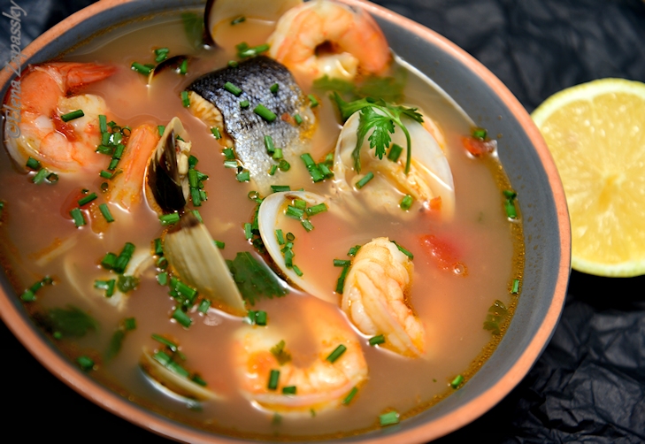 Первая подача ухи празднична, куски рыбы, створки мидий, клешни крабов, петрушка, укроп, зелёный лук – красиво, обычно это приходится на выходной день при стечении населения. На следующий день, после работы всё значительно беднее, тут идёт в ход рыбная мякоть, добытая из головы, и забытые случайные креветки.