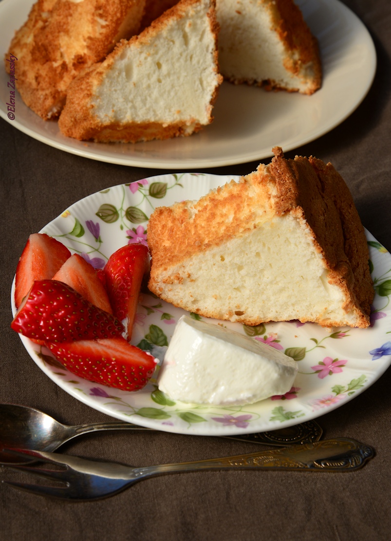 Классическая форма для этого десерта — высокая, круглая, с отверстием посередине. Форму не смазываем. Разогреваем духовку до 170°С. Муку и половину количества сахара соединяем, просеиваем через сито и оставляем в стороне. С помощью миксера взбиваем белки. Добавляем в белки лимонный сок, крем тартар, соль и оставшийся сахар. Продолжаем взбивать до пикового состояния. Высыпаем в взбитую белковую массу просеянную муку с сахаром и перемешиваем деревяной ложкой легкими круговыми движениями. Полученным воздушным тестом заполняем форму и ставим ее в духовку. Печем до готовности и еще немного, 20- 35 минут, в зависимости от размера. Вынимаем и ставим форму с тортом вверх дном остужаться на решетку или на горлышко бутылки. Торт должен парить в пространстве, чтобы силы гравитации помогли отделиться ему от стенок формы, так я понимаю этот важный момент. Главное, чтобы он не упал.