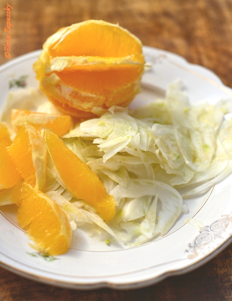 Из очищенного апельсина вырезаем острым ножом мякоть. Кусочки апельсина перемешиваем с фенхелем. Из остатков апельсина выжимаем сок, добавляем в него немного лимонного сока, соли, чуть-чуть сахара, оливкового масла. Это заправка. Немного свежемолотого перца, и салат готов. Как раз сезон.