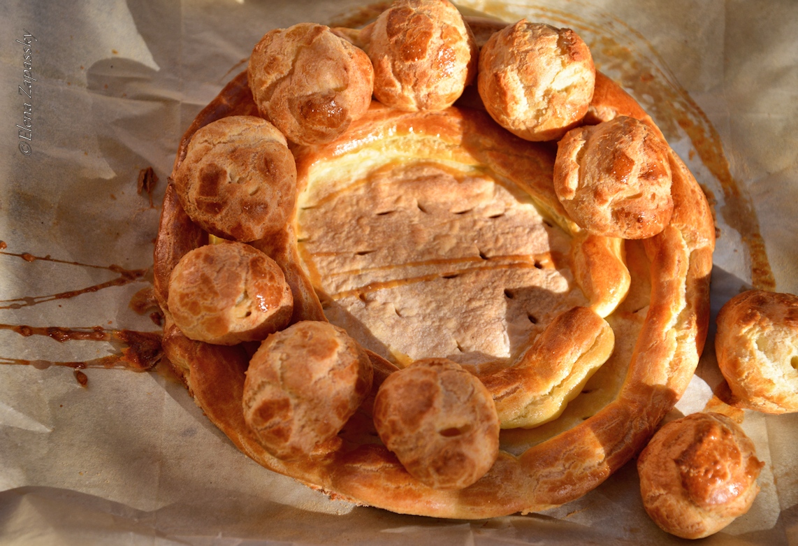 Разогреваем духовку до 180°С. Заварное тесто перекладываем в кондитерский конус и выкладываем на противень, слегка смазанный маслом, 12 шариков размером чуть меньше грецкого ореха. Смазываем их яйцом и ставим их печься на 15-20 минут.Когда профитроли будут готовы, можно перейти к выпечки основания. На пергаментной бумаге раскатываем песочное тесто толщиной 3 мм. С помощью тарелки вырезаем круг диаметром 20 см. Из заварного теста, которое находится в конусе, делаем по краю песочного круга бордюр, затем делаем второй круг внутри первого. Песочное тесто слегка тыкаем протыкаем или делаем надрезы ножом, я заметила, что словарь описания рецептов часто не оставляет место сантиментам. Ставим в духовку и 15 минут не открываем ее, так пишут, может, это правда. Когда все пропечется, зарумянится, вынимаем из духовки и даем остыть.