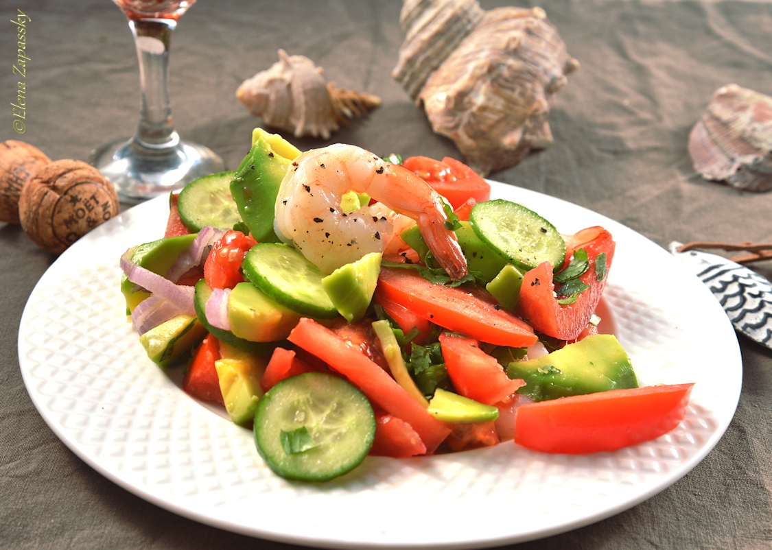 Креветки жарим, как описано в рецепте Жареные креветки, кроме чеснока можно добавить кусочки свежего имбиря(ג’ינג’ר, ginger). Нарезаем овощи: помидоры, лук, огурец, авокадо. Зелень: петрушку, кориандр. Перемешиваем с креветками. Солим. Выжимаем сок из половинки лимона. Наливаем оливкового масла. Перчим.