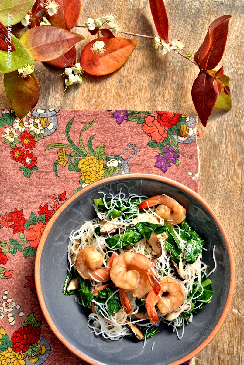 Тонкую рисовую лапшу заливаем теплой водой и держим ее так 20 минут. Делаем маринад и за 5-10 минут до жарки кладем в него креветки. Перед жаркой вынимаем креветки из маринада, маринад процеживаем, он пригодится нам в дальнейшем для лапши. Жарим креветки на хорошо разогретой сковороде, смазанной маслом. Жарим на одной стороне 2 минуты, затем переворачиваем и жарим еще 2- 3 минуты. На другой сковороде жарим грибы до готовности, если грибы сухие, их предварительно вымачиваем в течение часа. В конце добавляем порезанные листья бок чой, перемешиваем, 3 минуты и они готовы. Лапшу откидываем на дуршлаг, затем жарим ее слегка на сковороде или воке, наливаем маринад, что остался от креветок, перекладываем в лапшу креветки и грибы с капустой, тушим все вместе несколько минут, перемешивая.
