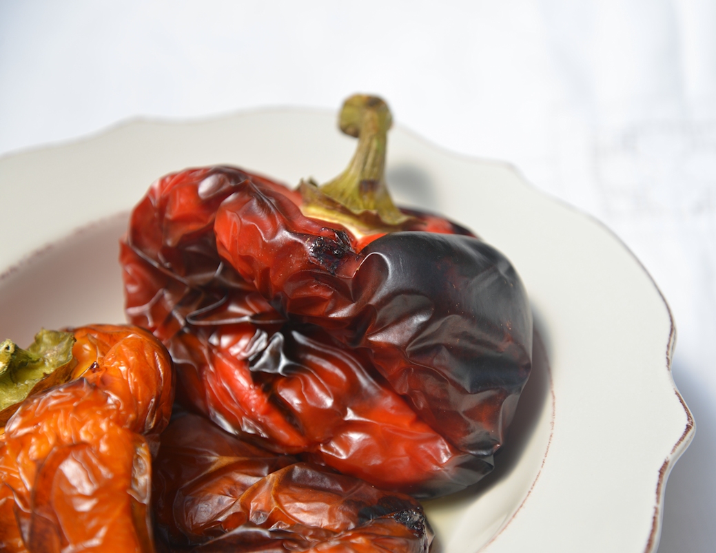 Перцы целиком запекаем в хорошо нагретой духовке. Запекаем до кондиции, которая близка нашему сердцу. Кто-то любит, чтобы перцы немного хрустели, а кто-то, как я, расквашенные. Перцы чистим, убираем кожицу, если возможно, затем режем на кусочки и складываем в тарелку. Добавляем немного лимонного сока, мелко нарезанного молодого чеснока, солим, наливаем оливкового масла.