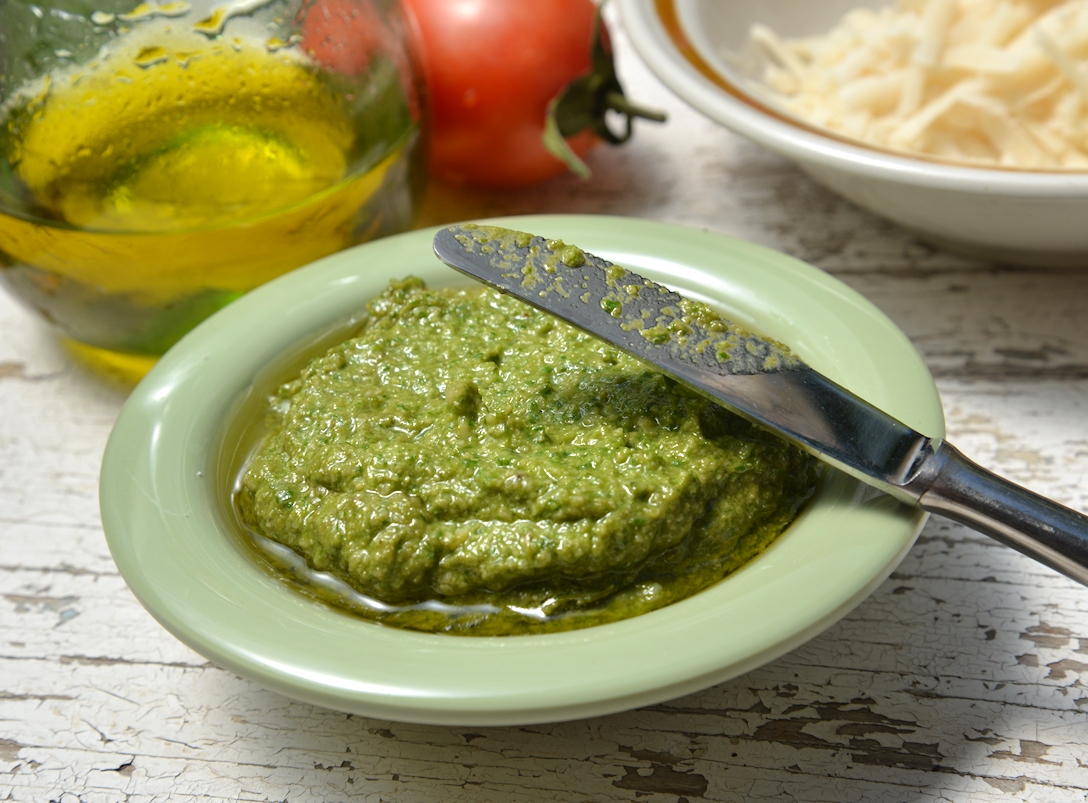 Есть разные варианты песто: вместо кедровых можно взять другие орехи, грецкие, например, и вместо базилика — рукколу. Я думаю, что каждый может делать песто по своему вкусу. Правильные люди растирают песто деревянным пестиком в каменной ступке, я использую блендер.