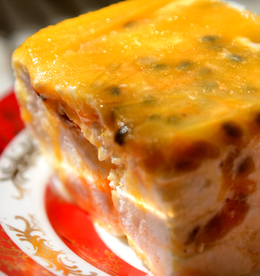 В форму для длинных кексов кладем тонкую плёнку, так, чтобы ее края свешивались. Пассифлору разрезаем поперек посередине и ложечкой вынимаем содержимое. Пассифлора должна быть спелой и вкусной. Желток с чайной ложкой воды размешиваем с сахаром и взбиваем венчиком на маленьком огне или на водяной бане, желтковая масса должна увеличиться в объеме и загустеть. Затем выливаем в кастрюльку с желтком пассифлору или желток перекладываем в посуду с пассифлорой и перемешиваем. Сливки взбиваем с ложкой сахара и ванилью до густой крепкой пены. Соединяем два источника, две составные части семифредо, но перемешиваем небрежно, слегка, и заполняем полученной вкусной воздушной массой подготовленную форму.