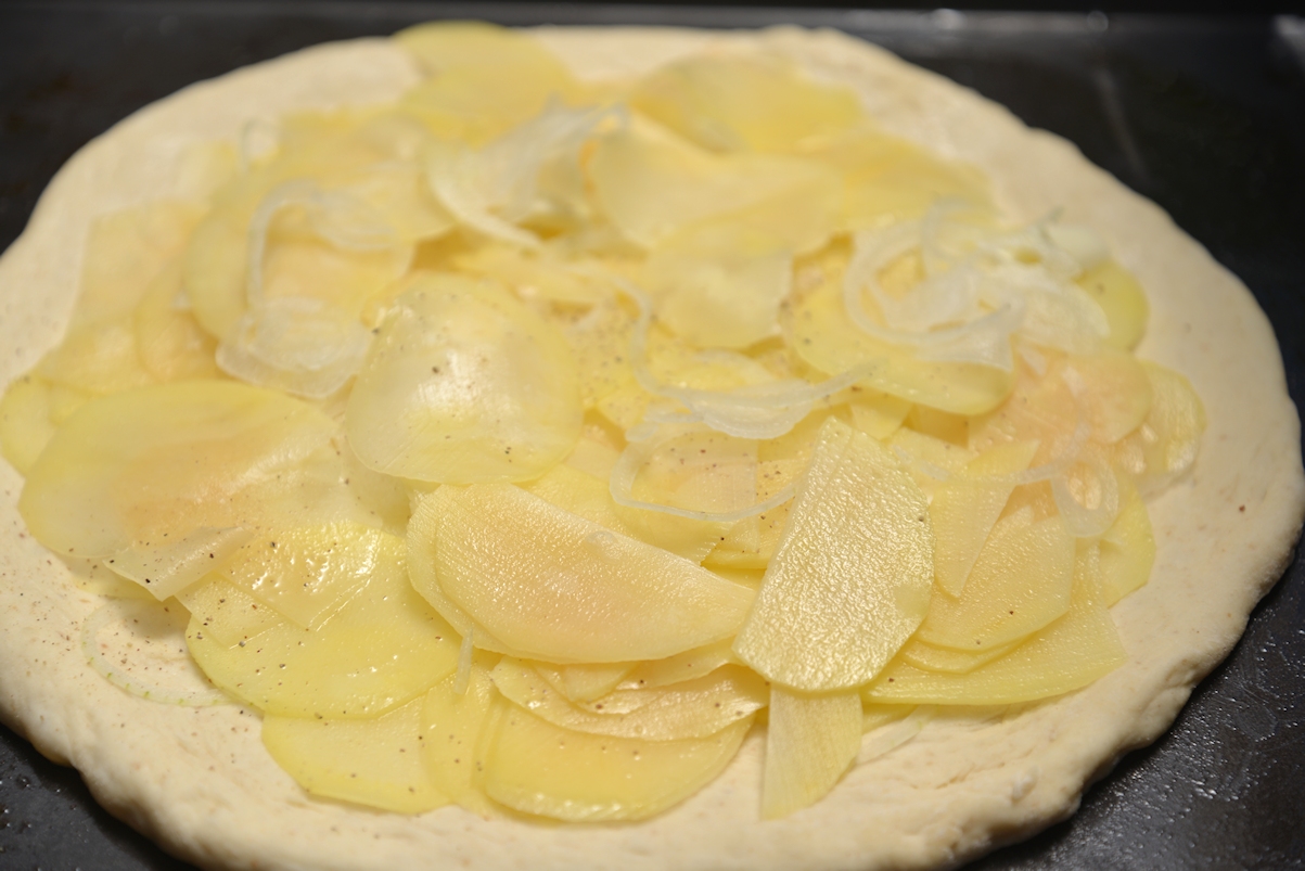 Дрожжевое несдобное тесто, как для пиццы, делим на две равные части. Раскатываем круг- основание, не толсто и не тонко, полсантиметра. Картофель чистим и режем на тонкие пласты с помощью мандолины. Белый лук нарезаем тонкими кольцами. На раскатанную лепешку кладем картофель вперемежку с луком. Солим, перчим. Добавляем маленькие кубики масла. Раскатываем вторую половину теста, закрываем ею пирог и защипываем края. Смазываем пирог желтком. Печем минут 20-25.