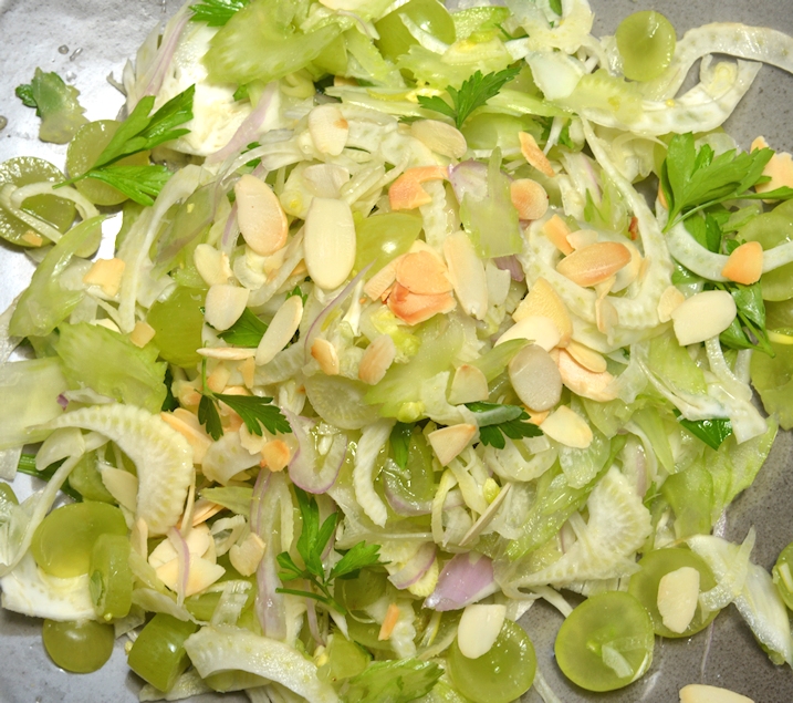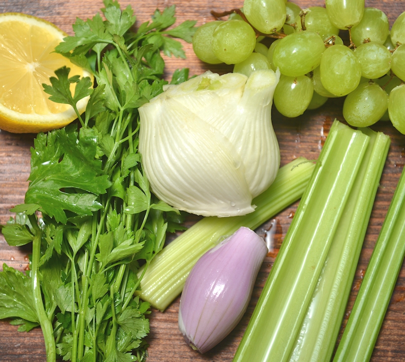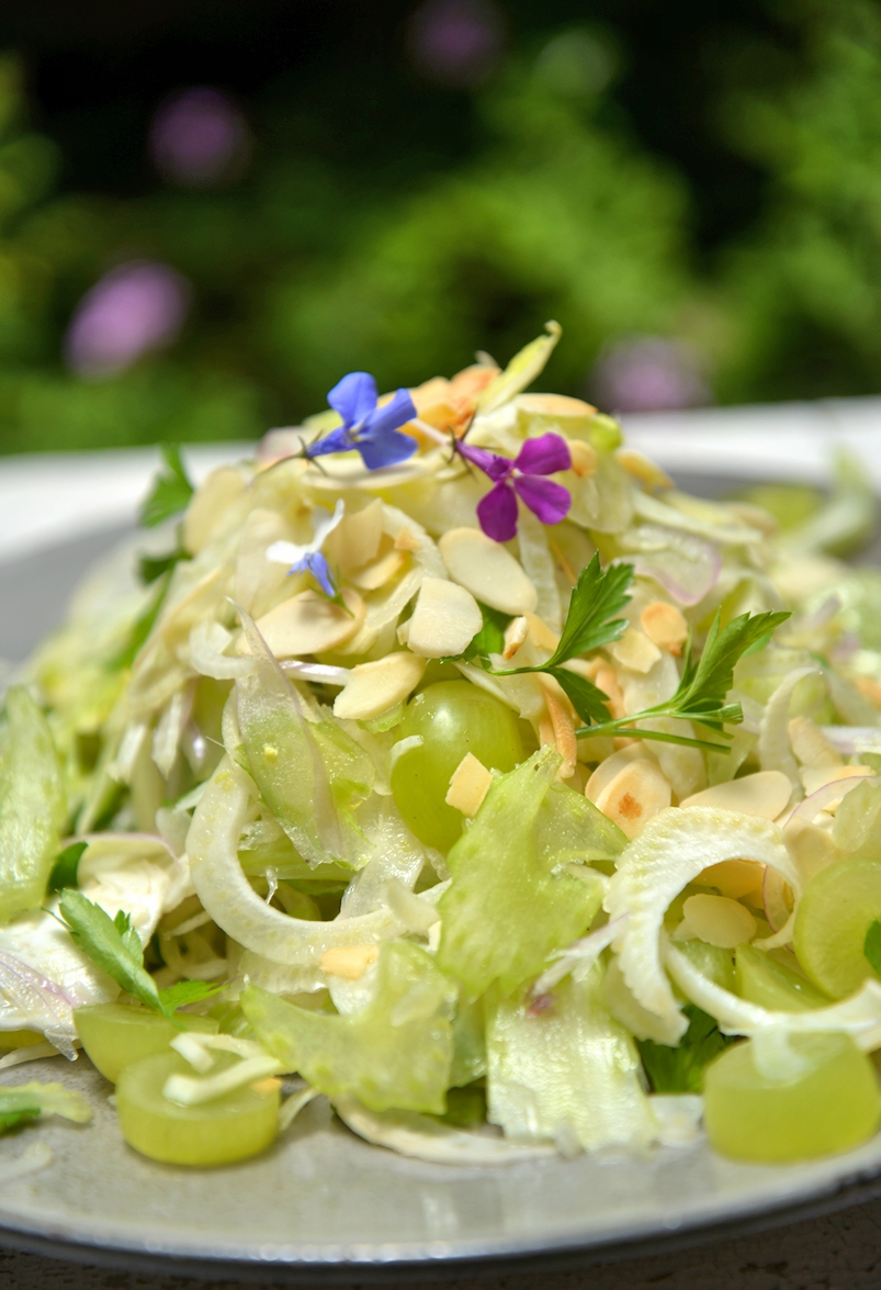 Фенхель, сельдерей и шалот тонко стругаем на мандолине. Слегка солим и руками отжимаем овощи, чтобы они дали сок. Виногорад нарезаем с помощью острого ножа. Красиво обрываем листики у петрушки и добавляем их в салат. Выжимаем сок из половинки лимона, наливаем немного оливкового масла и перемешиваем. Украшаем орехами, кедровыми или миндалем.