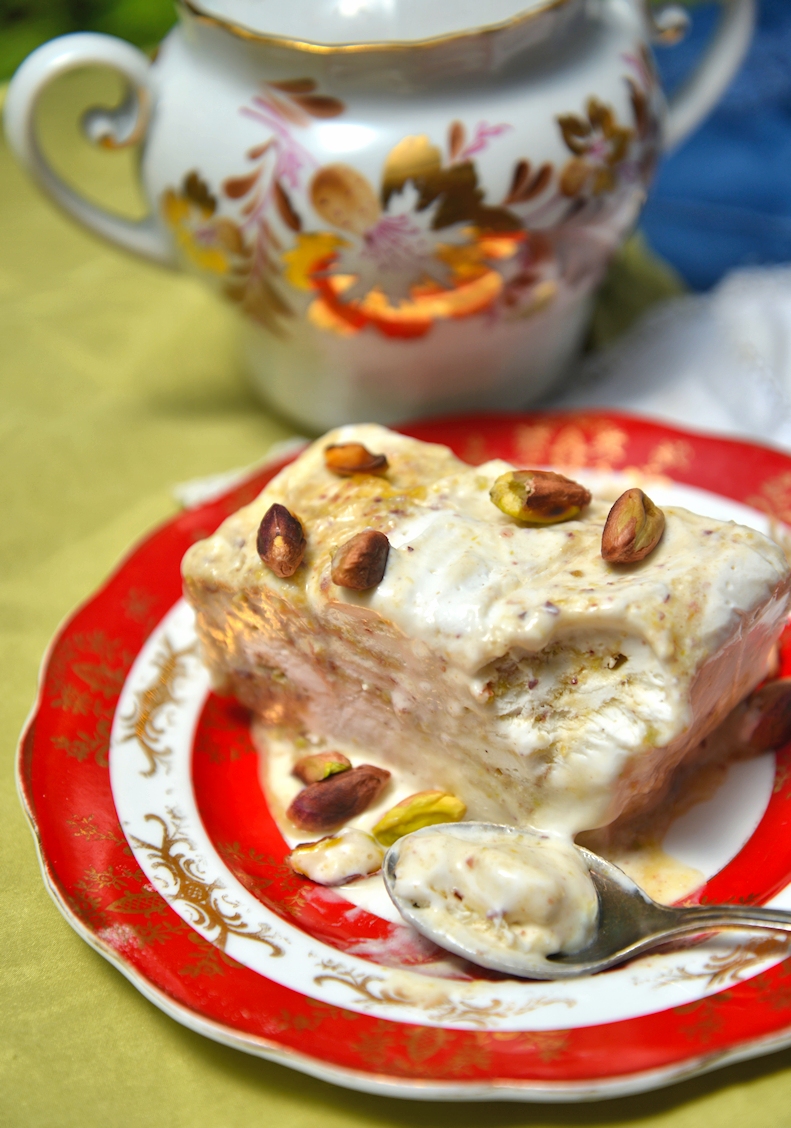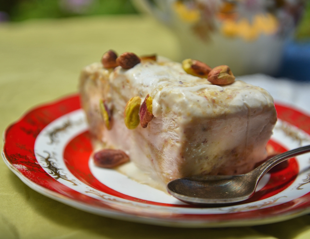 Для семифредо с фисташками надо почистить полстакана орехов. Очень внимательно и не один раз проверяем, не осталось ли в орехах скорлупы. Перемалываем орехи с помощью блендера, добавляем полстакана сахара, полстакана воды и варим все несколько минут. В отдельной кастрюлке, стоящей на самом маленьком огне, взбиваем венчиком или миксером желтки до загустения, важно не превратить яичную массу в яичницу. Соединяем орехи с желтками. Затем взбиваем сливки с сахаром и ванилью, пока не загустеют. Продолговатую форму для кексов обкладываем тонкой пленкой, соединяем две части семифредо, слегка перемешиваем и выкладываем в подготовленную форму, закрываем пленкой и оставляем на ночь замораживаться в морозилке.