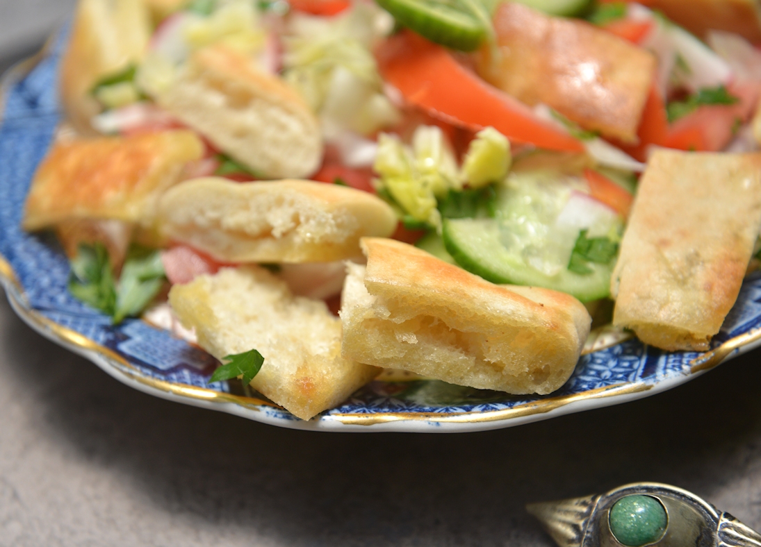 Фатуш — палестинский салат с поджаренными кусочками питы. Свежую питу нарезаем и жарим в оливковом масле, получаются очень вкусные хрустящие чипсы. Салат делаем обычный, из овощей, из того, что есть под рукой: