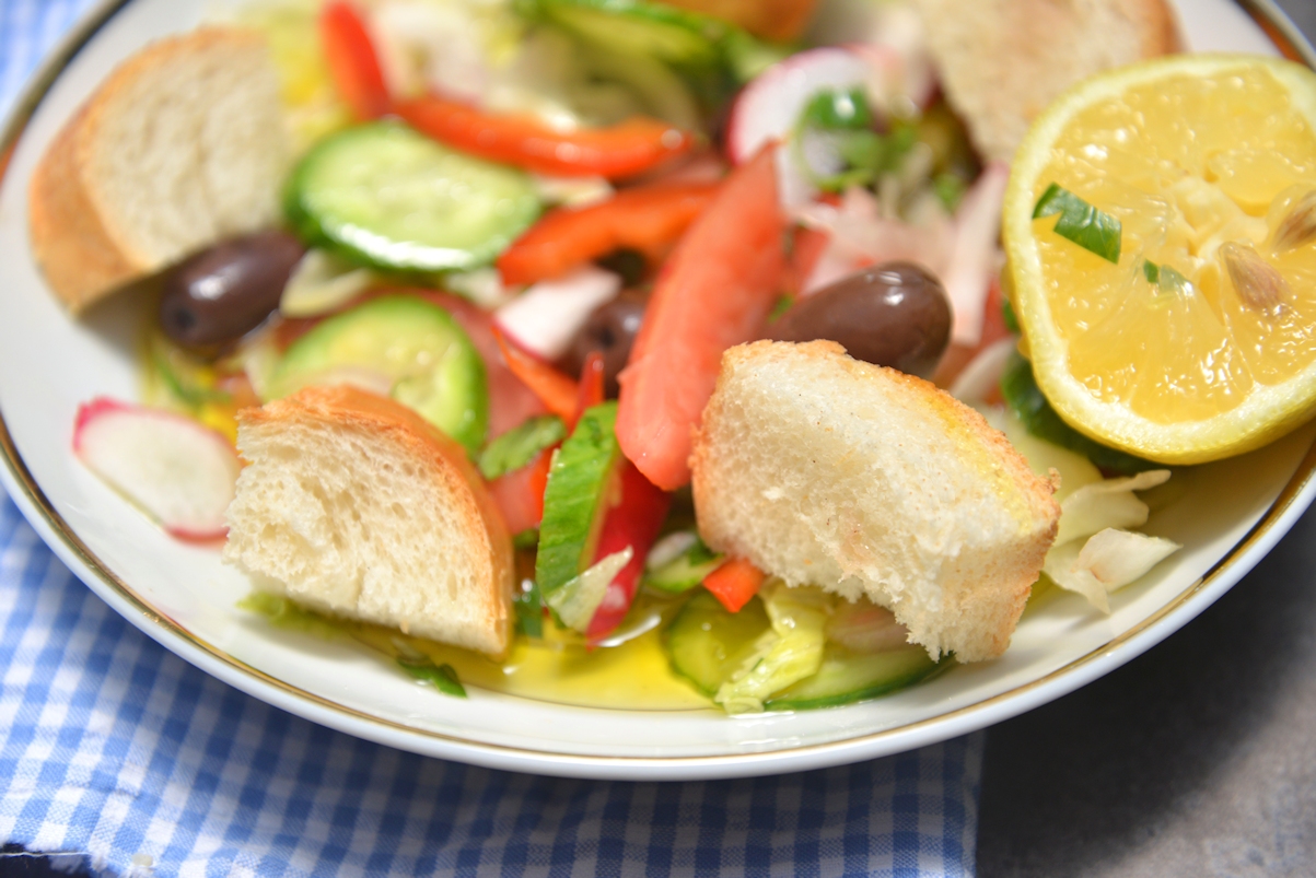 Панзанелла — салат итальянский, параллельный фатушу. Вместо питы, свежий белый хлеб. Поэтому панзанелла требует больше оливкового масла и лимонного сока.