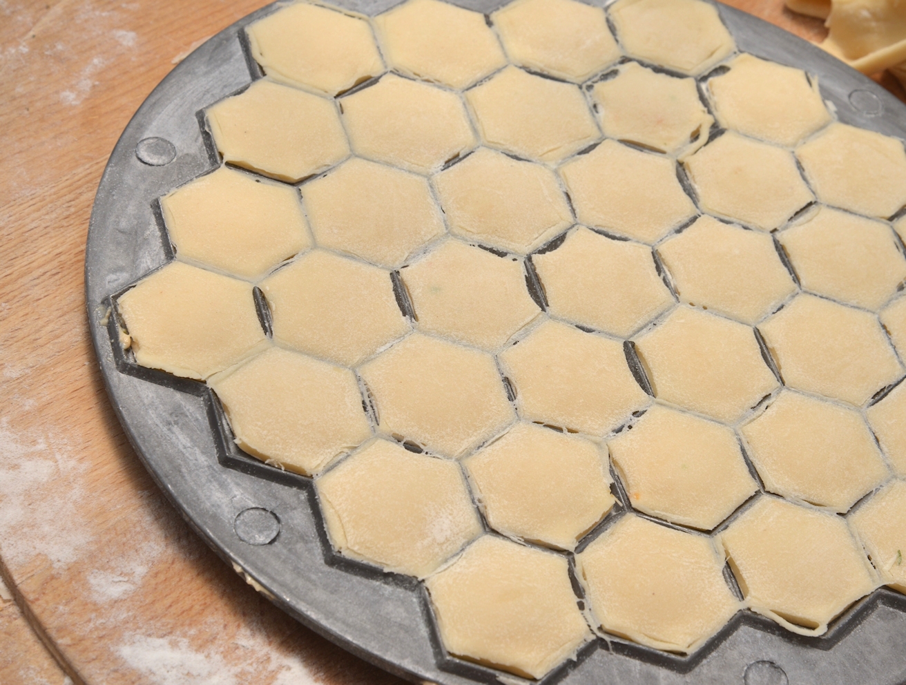 Тонко раскатываем два равных куска теста. На один из пластов раскладываем начинку, имея в виду размер равиолей. Вокруг каждой порции начинки смазываем тесто яйцом. Закрываем все вторым пластом, старательно утрамбовывая пространство вокруг начинок. Большой или средней рюмкой вырезаем равиоли, начинка должна быть в центре.