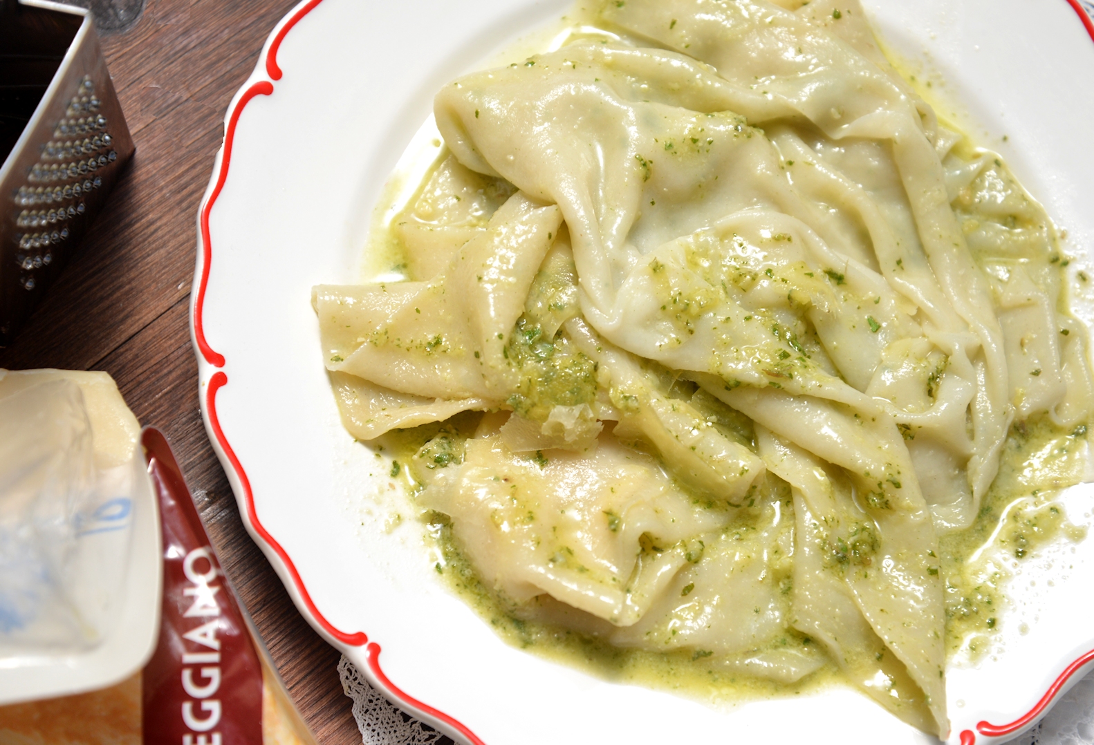 На припорошенной деревянной или мраморной доске раскатываем тесто до 1 мм. Вырезаем острым ножом или специальным колесиком квадраты 15×15 см. Варим в кипящей подсоленной воде.1-2 минуты и опрокидываем пасту на дуршлаг или вынимаем специальной ложкой-шумовкой.