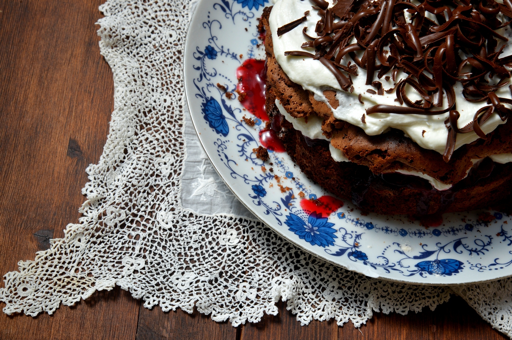 Вынимаем торт из формы, даем ему остыть на сетке-подставке. Разрезаем тесто на два пласта. Выкладываем вишню с сиропом на нижний пласт, закрываем вишни взбитыми сливками, оставив немного для украшения. Закрываем вторым пластом, смазываем его сливками и посыпаем натертым шоколадом.