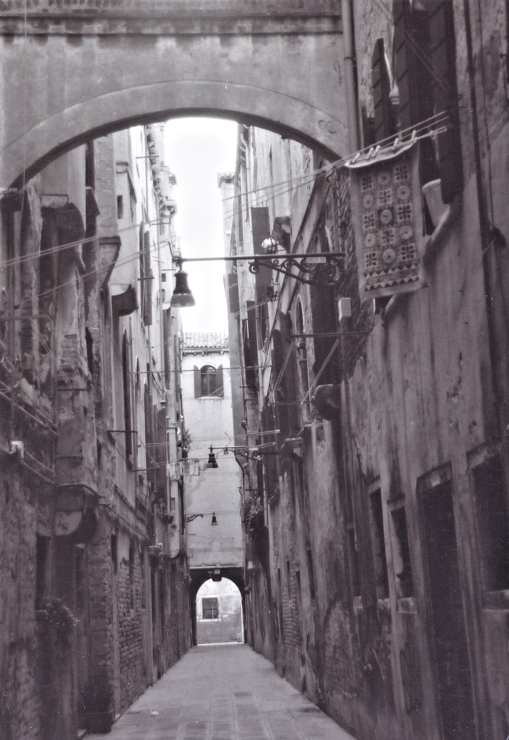 От рассказа Томаса Манна осталось чувство города зыбкого, неверного, роскошного и распадающегося. Вода. Рябь. Всплески. Отблески. Блики. Всхлипы. Эхо шагов в низких темных переходах-тунелях. Черно-зелёная бархатистая кайма по низу домов. Мраморные ступеньки ведут, погружаясь, в мыльно бирюзовую воду. Симметрия спирали на фасадах домов сбивает с равновесия.