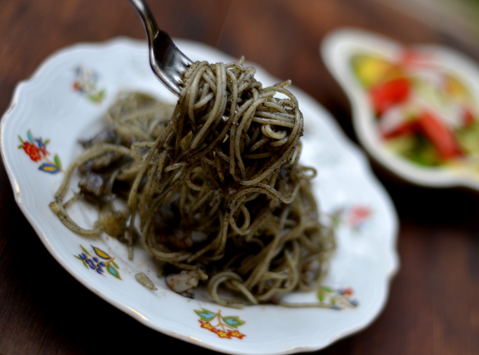 Когда чистим каракатиц осторожно собираем черные чернила, которые находятся в мешочке около головы и складываем их в баночку. Почищенные каракатицы мелко нарезаем. На сковороду наливаем немного оливкового масла, кладем мелко нарезанные лук и чеснок и жарим до прозрачности, затем добавляем каракатиц и продолжаем обжаривать несколько минут. Добавляем кусочки помидора и держим все на небольшом огне еще 10 минут. Солим, перчим. Кладем в соус чернила, перемешиваем и убираем огонь. Тем временем варим пасту, длинные спагетти. Готовую пасту перемешиваем с соусом. Черная паста — белое вино.