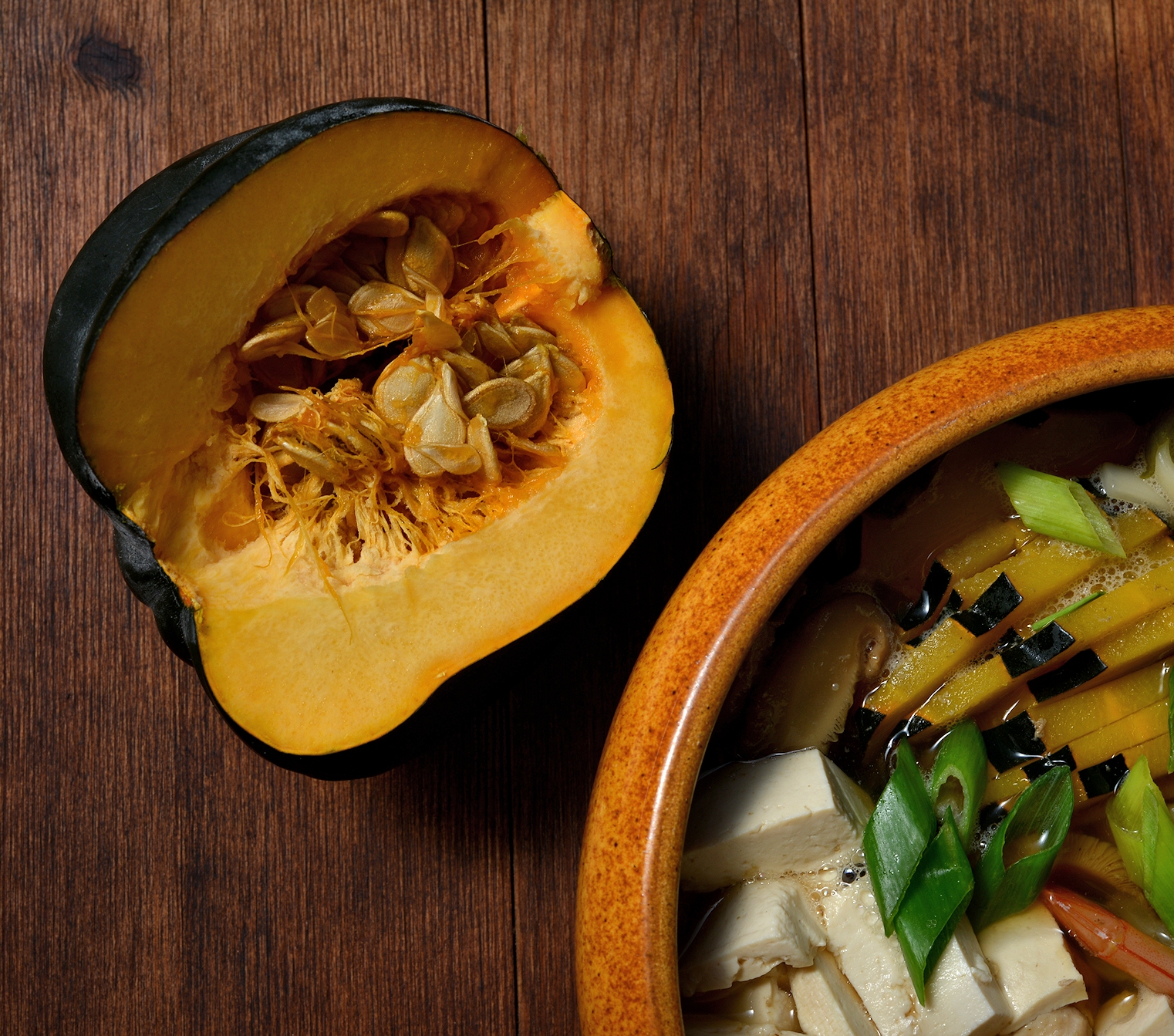 В горшочек наливаем воду, добавляем столовую ложку соевого соуса, столовую ложку саке, если есть, и полчайной ложки порошка даши. Кладем грибы, порезанные полосками, сухие водоросли вакаме, кусок маленькой тыквы, тоже порезанный, кусочки куриного мяса и варим минут 10. Затем добавляем тофу, его режем кубиками, и почищенные креветки. Варим минуты 3. В конце кладем сваренную длинную японскую, если есть, лапшу. Проверяем соль. Варим еще минуту. Овощи, мясо, морепродукты и грибы могут варьироваться. Свобода творчества приветствуется.