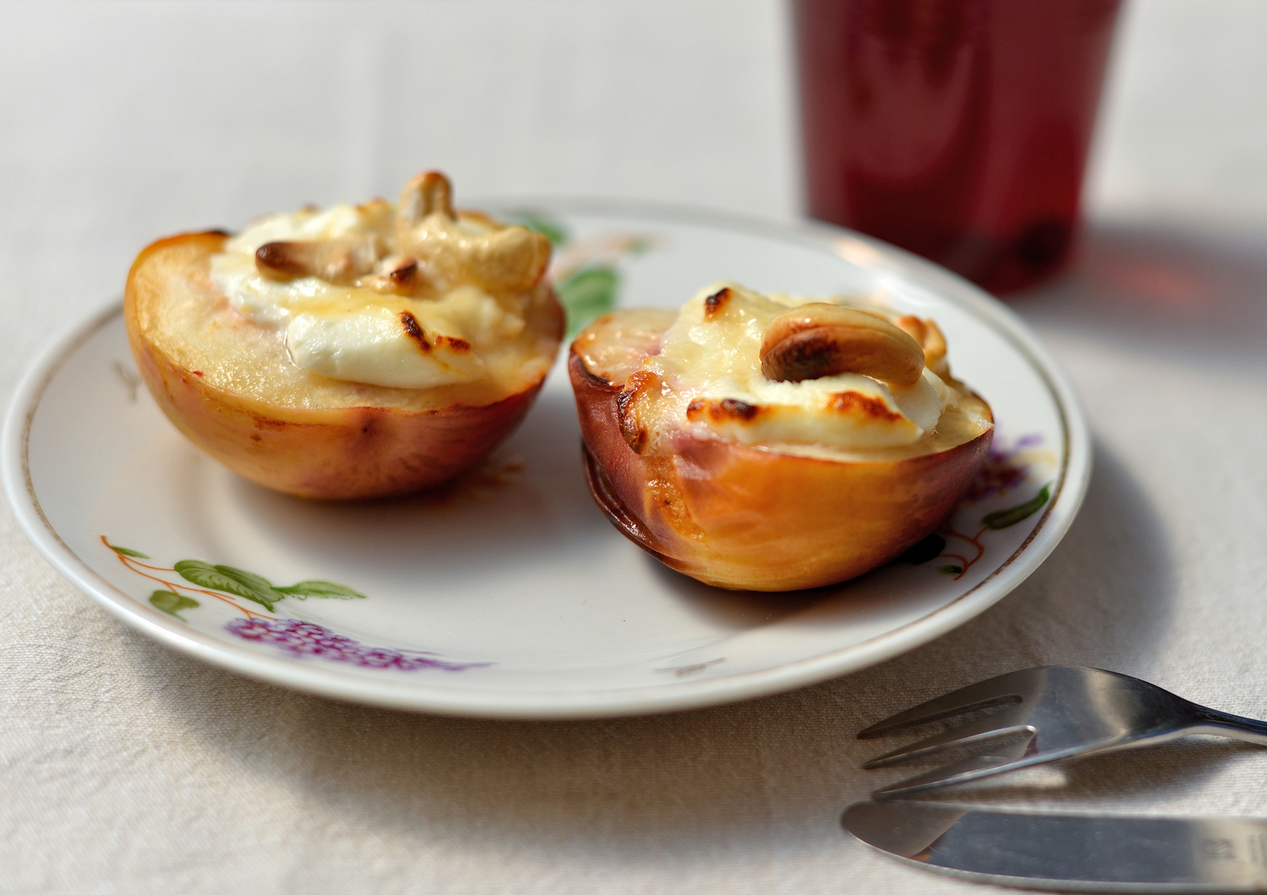 Простейший десерт: на половинку спелого персика кладем столовую ложку мягкого козьего или овечьего сыра, сверху наливаем чайную ложку меда и кладем орешки. Кладем на сковородку с небольшим количеством сливочного масла и ставим в разогретую духовку на 10 минут, если не меньше. Десерт простой, но есть его надо, пользуясь ножем и вилкой для десертов, что является высшей степенью буржуазности (по фильму Фон Триера).