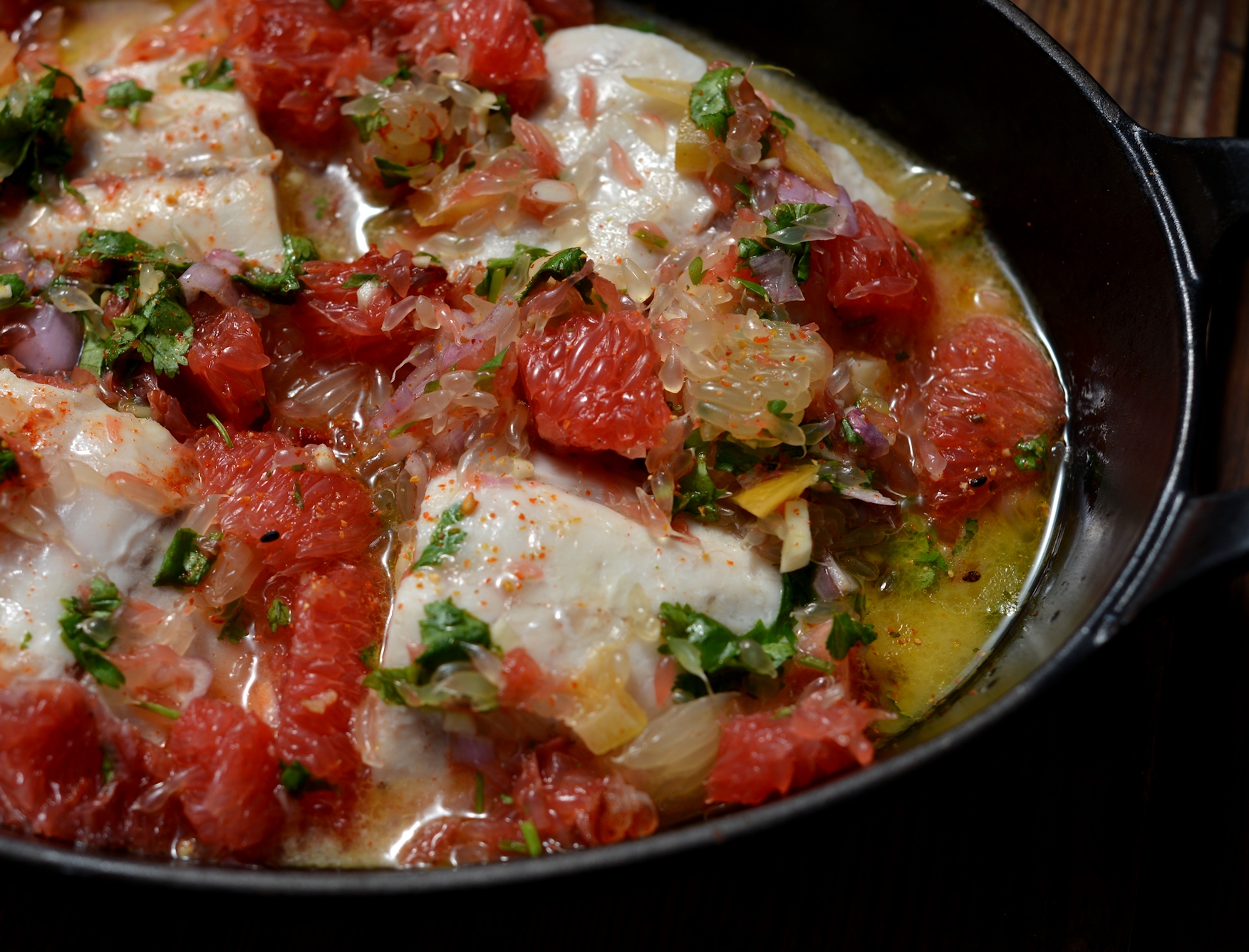 Острым ножом вырезаем мякоть грейпфрута без перегородок, добавляем все остальное, лук и чеснок мелко режем, имбирь натираем, зелень мелко рубим. На разогретую сковороду с растительным (оливковым) маслом кладем куски рыбы, закрываем крышкой и доводим до готовности. Выключаем огонь, даем рыбе немного остыть и заливаем ее соусом.