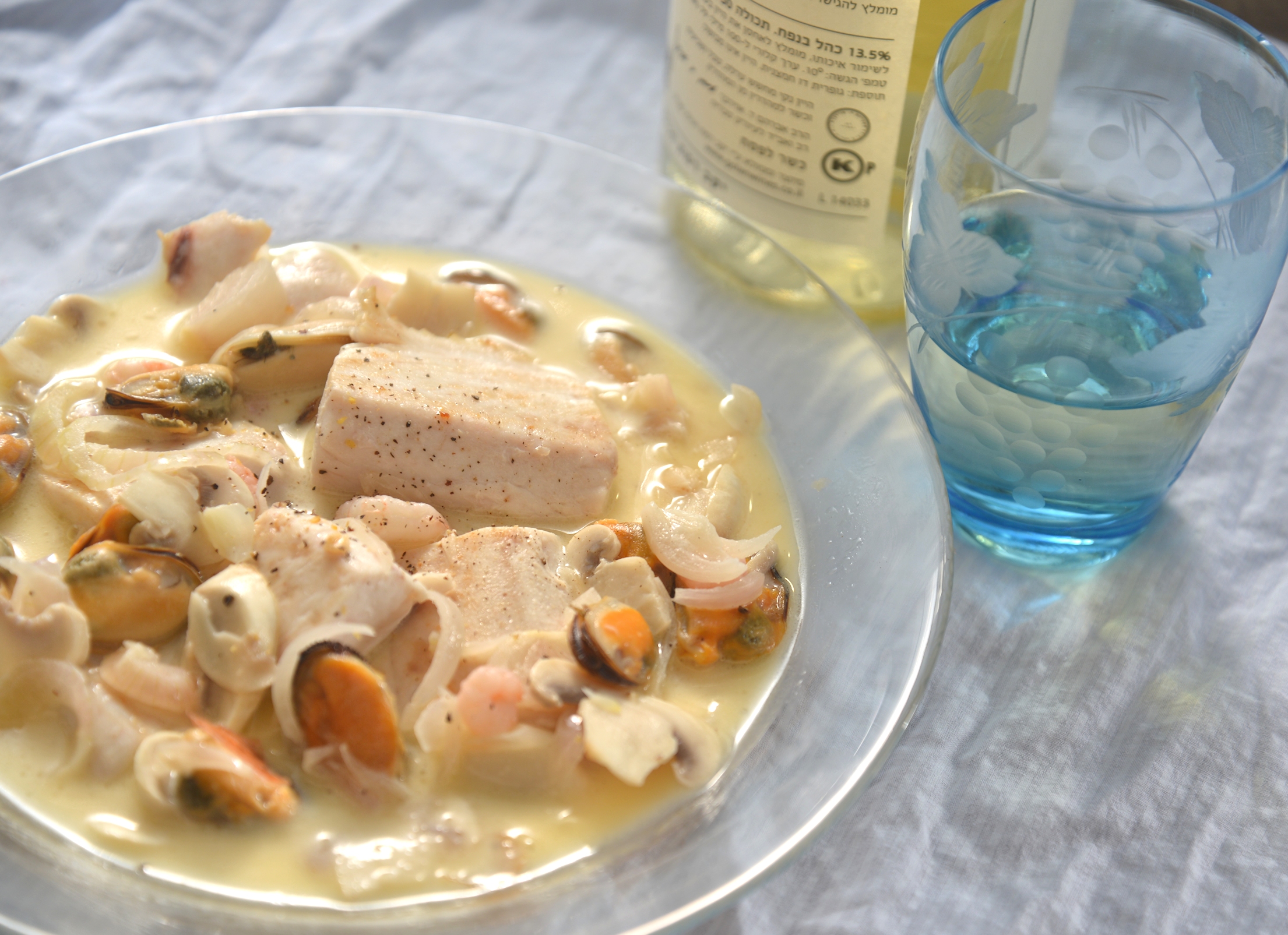 В сотейник кладем половину количества сливочного масло, крошим туда 1 шалот и жарим до запотевания, наливаем половину количества вина, почищенные креветки, мидии в раковинах, закрываем крышкой и варим 5 минут. Убираем из сотейника креветки и мидии, соус процеживаем в подходящую посуду. В сотейник добавляем другой шалот, нарезанный мелко, грибы, промытые и нарезанные, как мы любим, наливаем оставшееся вино и варим с открытой крышкой до готовности грибов и еще немного. Наливаем соус, сохраненный на первом этапе, варим пока не испарится алкоголь, затем добавляем оставшееся масло и сливки. Креветки и почищенные мидии возвращаем в соус. Солим, перчим. Рыбу готовим на сливочном масле на сковороде самым простым образом: слегка солим и перчим, кладем на сковороду с маслом, жарим минуту, переворачиваем и доводим до готовности на маленьком огне. Порцию рыбы щедро заливаем соусом. Едим, запивая оставшимся вином и подъедая соус с помощью свежего белого хлеба.