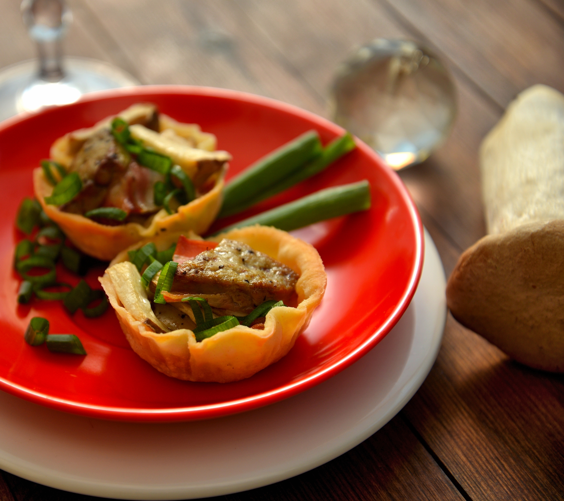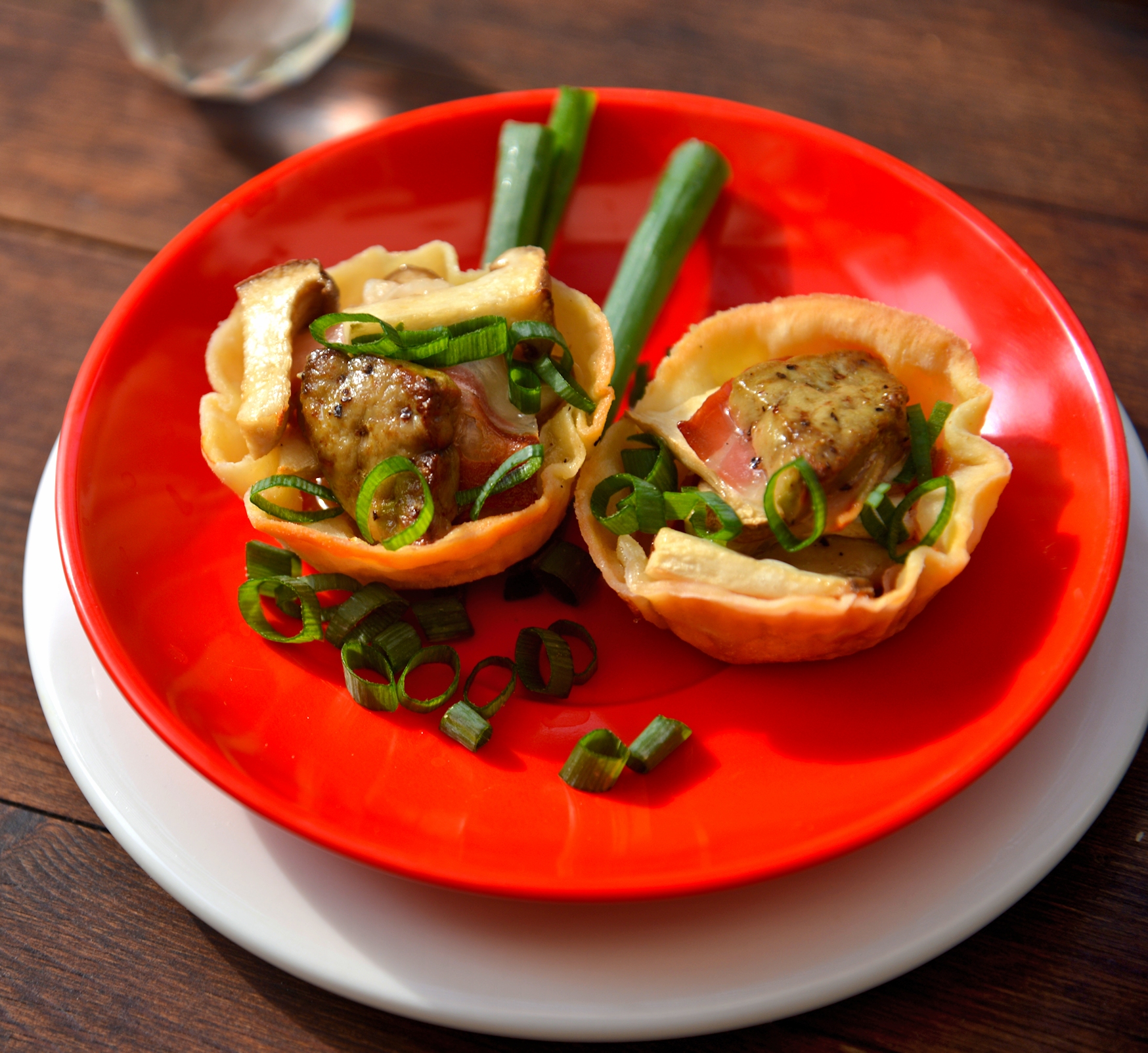 Небольшие формочки смазываем маслом и обкладываем их тонко раскатанным тестом. На дно кладем тонкий кусочек бекона, на него кусочек гусиной печени, перчим, следующими должны быть трюфели, я их не нашла в нашей лавке, но зато купила китайские грибы. Тонкие пласты этих грибов заменили мне трюфели, которые, наверное, так любила Царица. Есть у меня еще масло с запахом трюфелей, и я, как Земляничка из Чиполлино, которая нюхала фантики от конфет, если кто помнит, добавила несколько капель этого масла. Затем еще один кусочек печени, грибы и бекон. В оригинальном рецепте в книге Эскофье надо закрыть тарталетку слоем теста и защипать края, мои тарталетки были слишком малы для этого. Я просто поставила их в нагретую духовку на 10-15 минут, пока все не запеклось. Бекон всегда можно заменить копченым гусем.