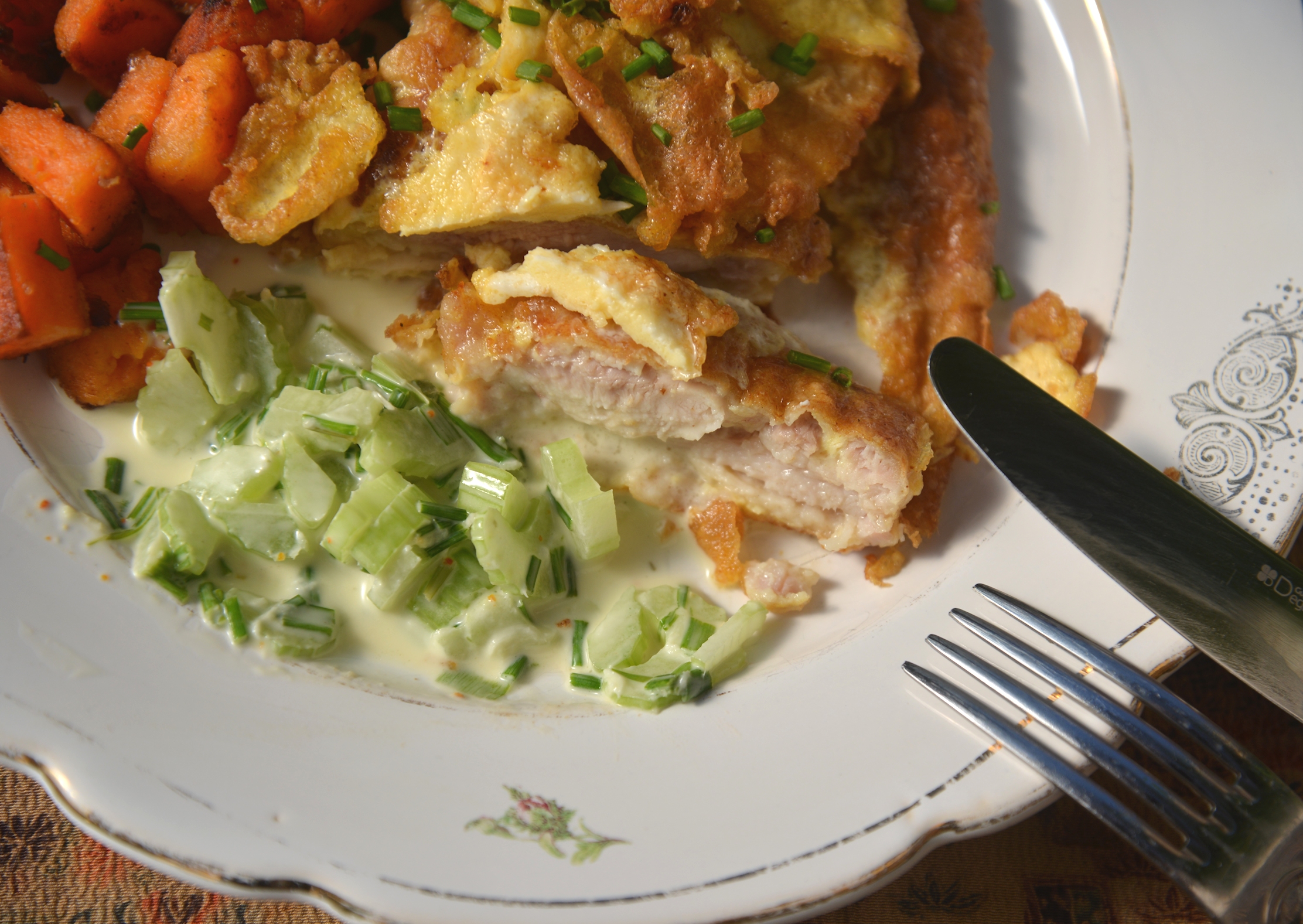 Для этого блюда нужно бедрышко цыпленка без кости, но с кожей. Это не так сложно сделать. Убираем аккуратно все кости и все. Расправляем полученный кусок и обваливаем его в муке. Нагреваем сковороду с растительным маслом, в оригинале надо жарить в глубоком масле, у меня на это не было сил. Обваленного в муке цыпленка обмакиваем в хорошо размешенном яйце и кладем на сковороду кожей вниз. Жарим, переворачиваем, доливая оставшееся яйцо. Доводим до готовности.