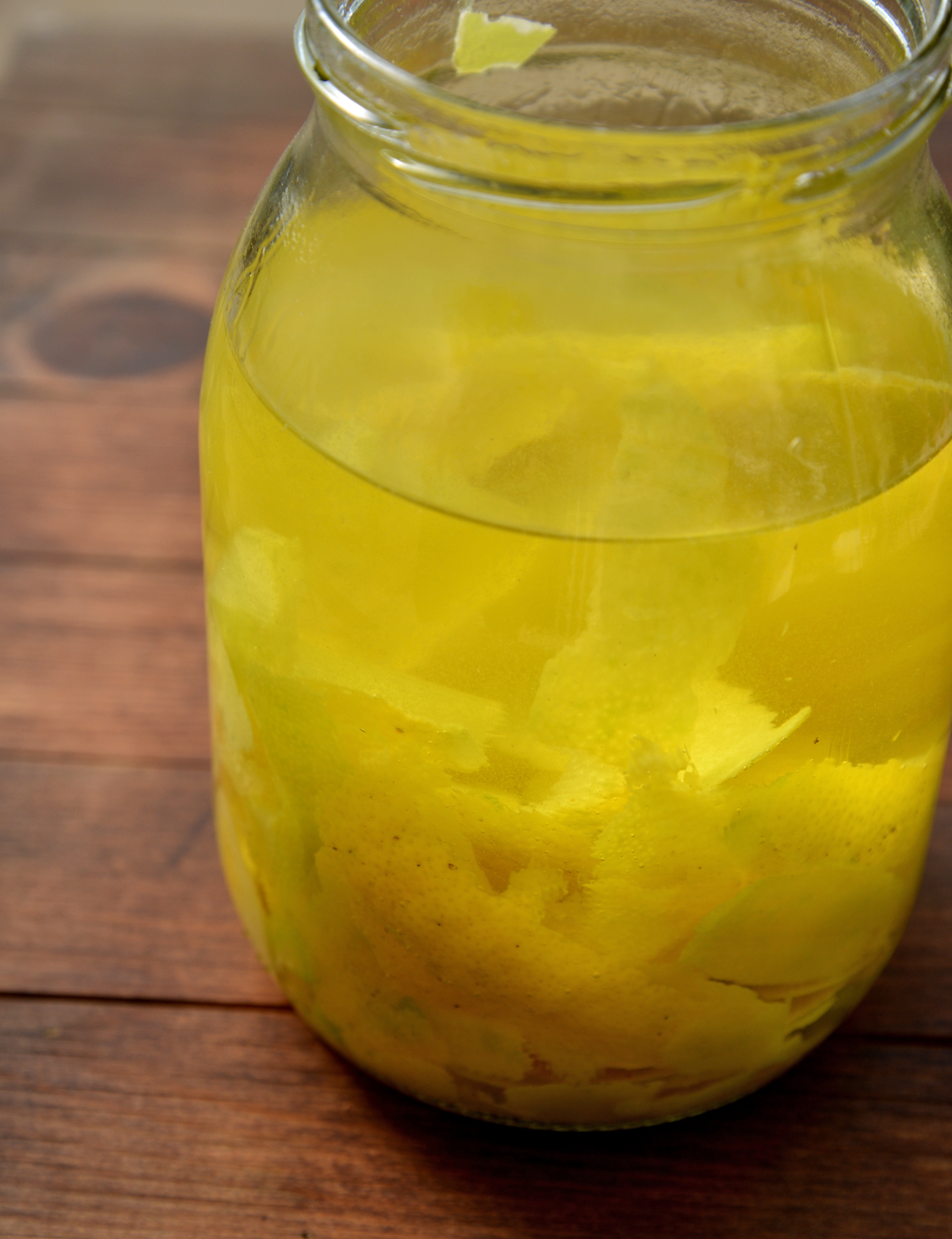 Ножом для чистки овощей тонко срезаем цедру со всех предварительно помытых лимонов. Голые лимоны прячем в холодильнике, их можно использовать, пока они не испортятся. Корочки складываем в сосуд с герметичной пробкой или крышкой и заливаем их водкой. Настаиваем в течение 2 недель при комнатной температуре.
