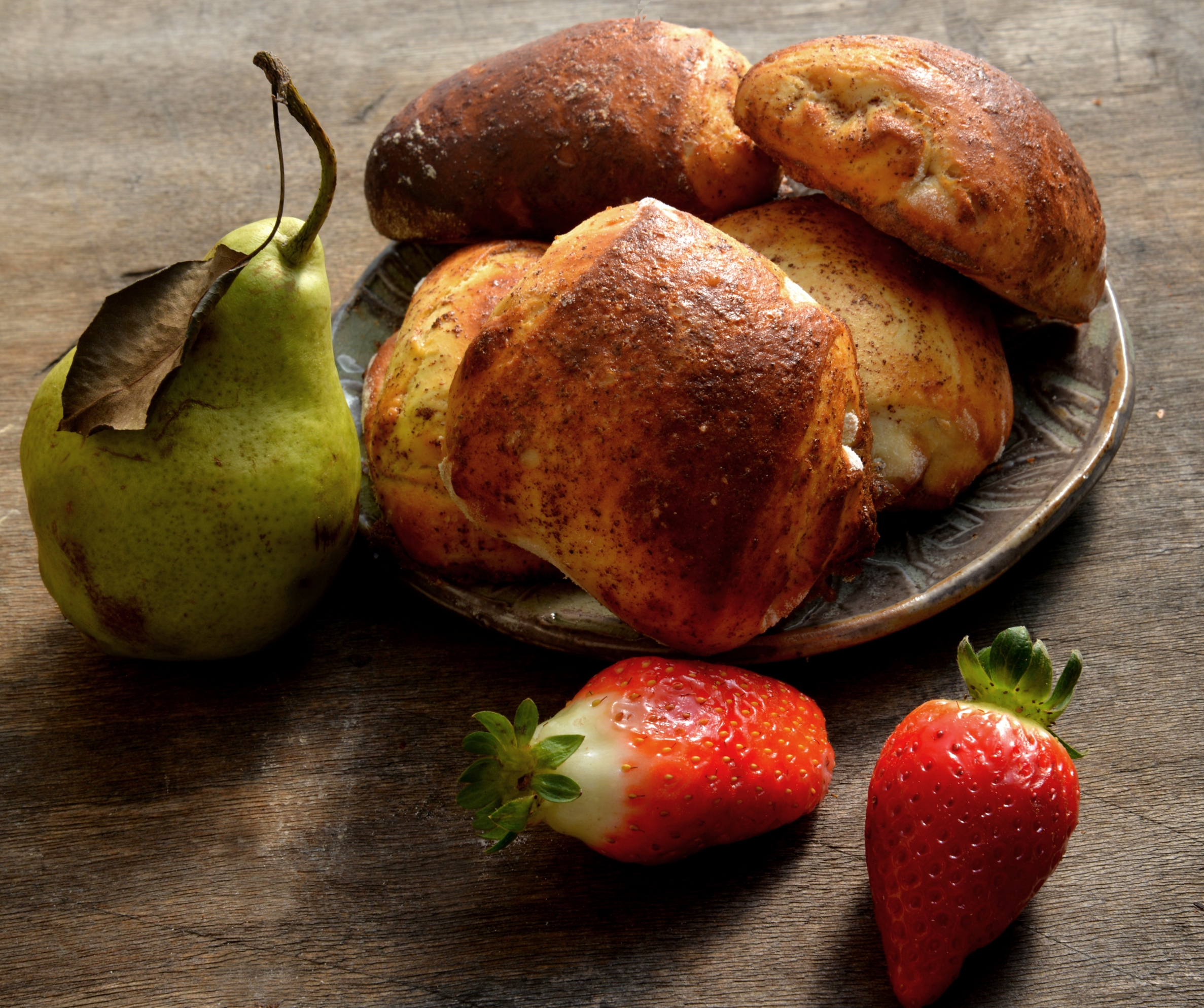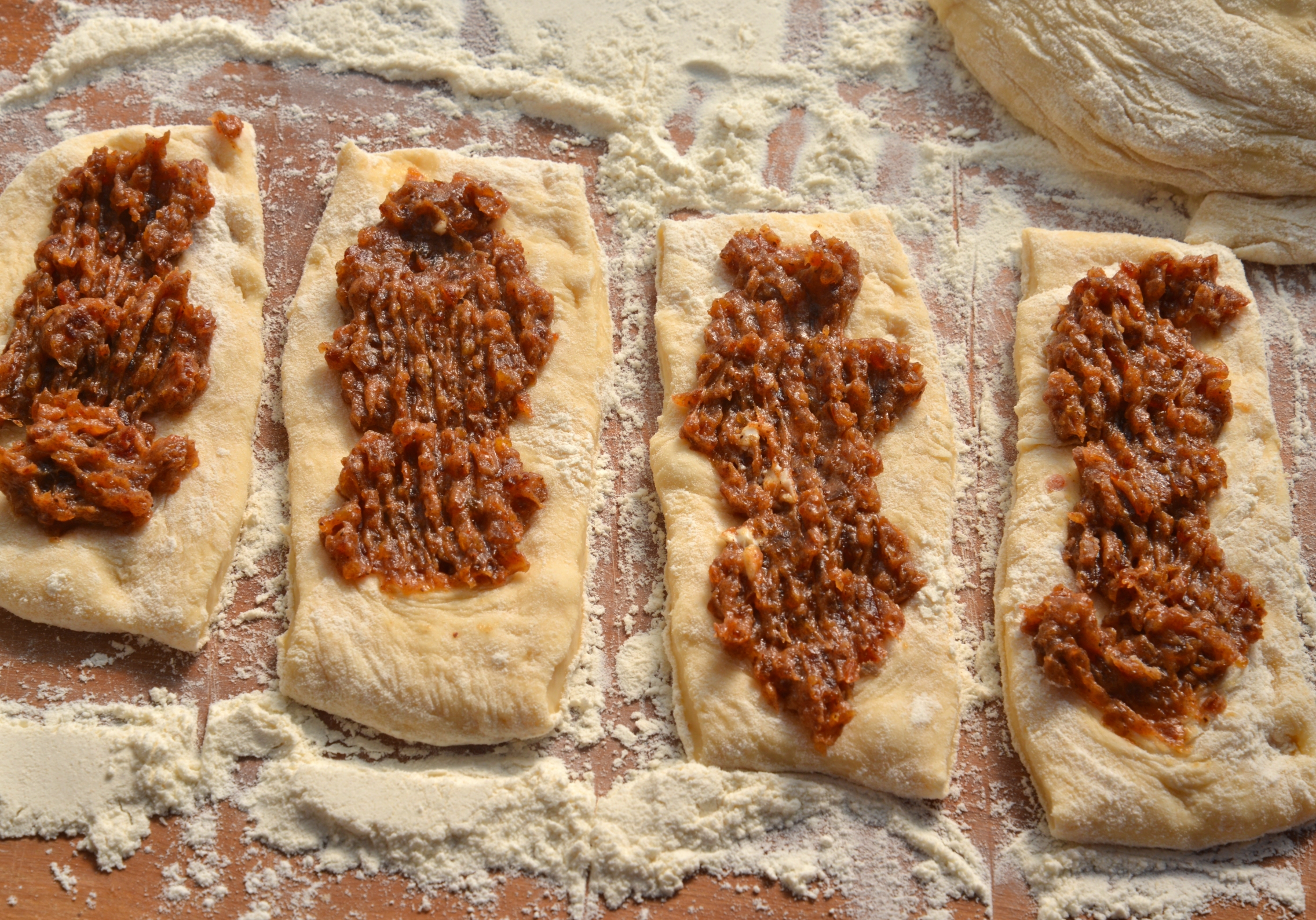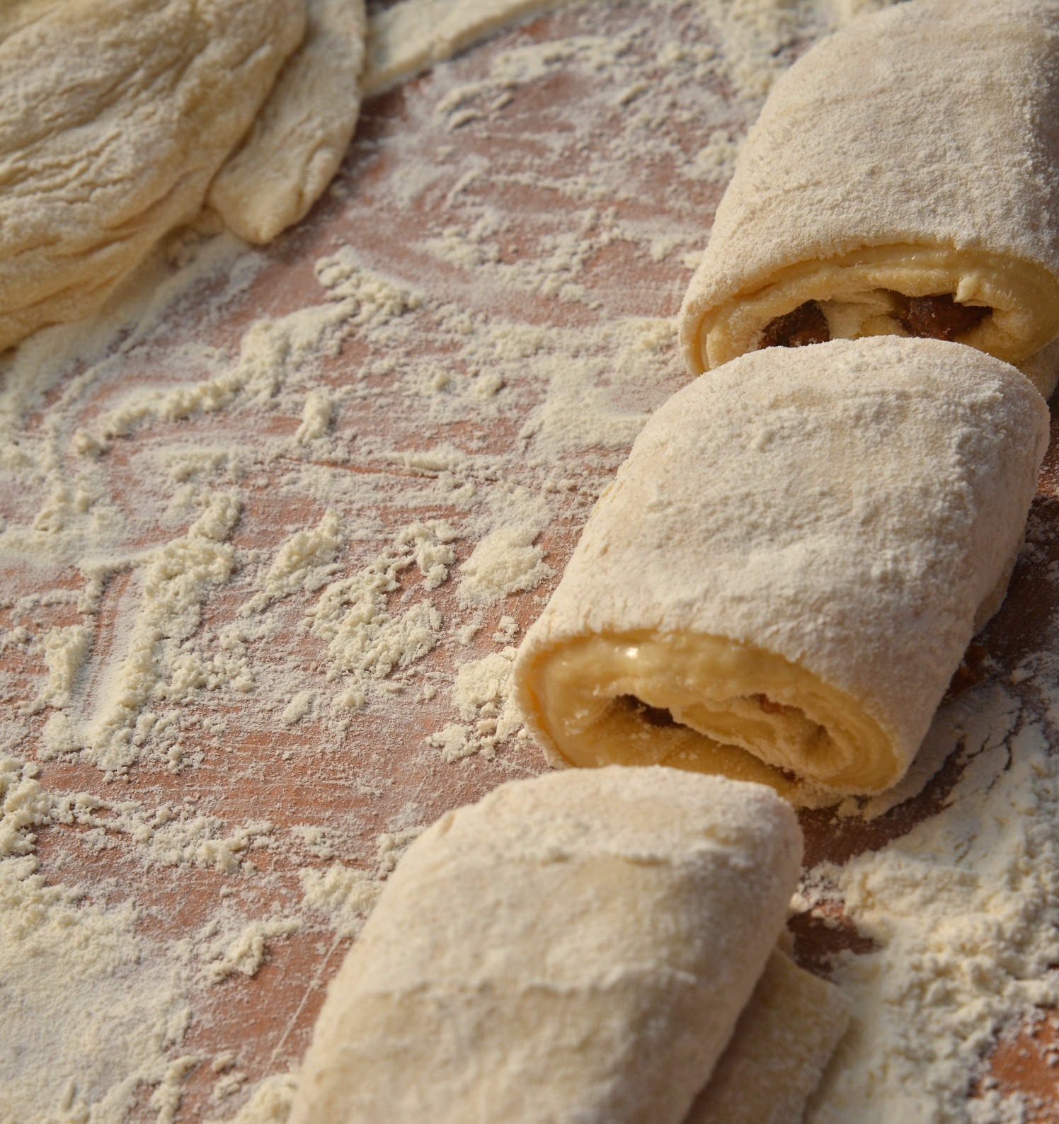 Раскатываем тесто, разрезаем его на порции. Кладем начинку и заворачиваем в рулеты. Смазываем сверху яйцом с корицей и сахаром и даем полчаса на расстойку.