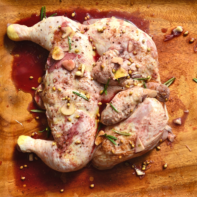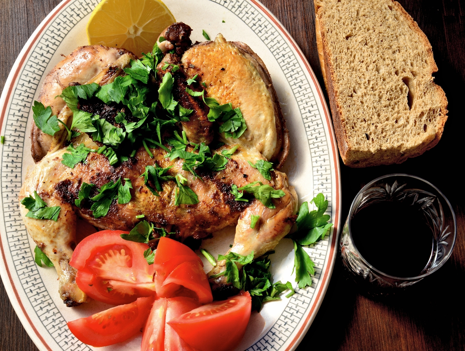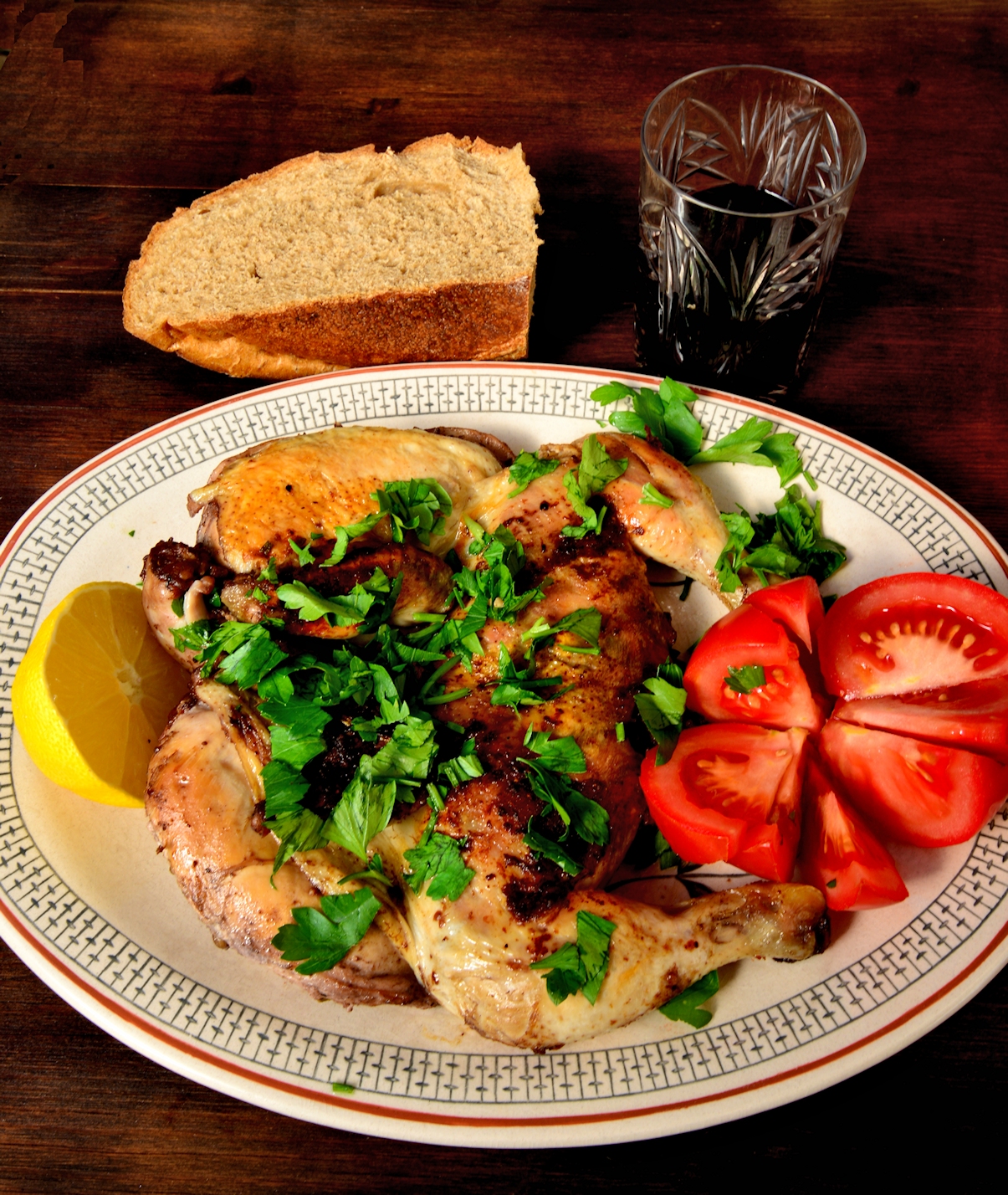 Тушку цыпленка разрезаем со стороны грудки и расплющиваем. В оригинальном рецепте, расплющивают его специальным прессом до хруста костей, но можно ограничиться приданием тушке плоской формы. Кладем цыпленка с миску с плоским дном и заливаем маринадом, втирая чеснок и приправы в цыплячье мясо и кожу. Оставляем мариноваться на несколько часов в холодильнике. Разогреваем большую сковороду с толстым дном, наливаем немного масла и кладем цыпленка спинкой на сковородку. Затем ставим на него подготовленный груз. Это может быть большой кирпич или камень, обернутый фольгой или большая кастрюля с водой. Жарим на среднем огне минут 15, затем цыпленка переворачиваем и жарим ещё минут 15. Постепенно доводим цыпленка до готовности, следя, чтобы он не подгорел. Подаем с салатом. Красное вино не помешает.
