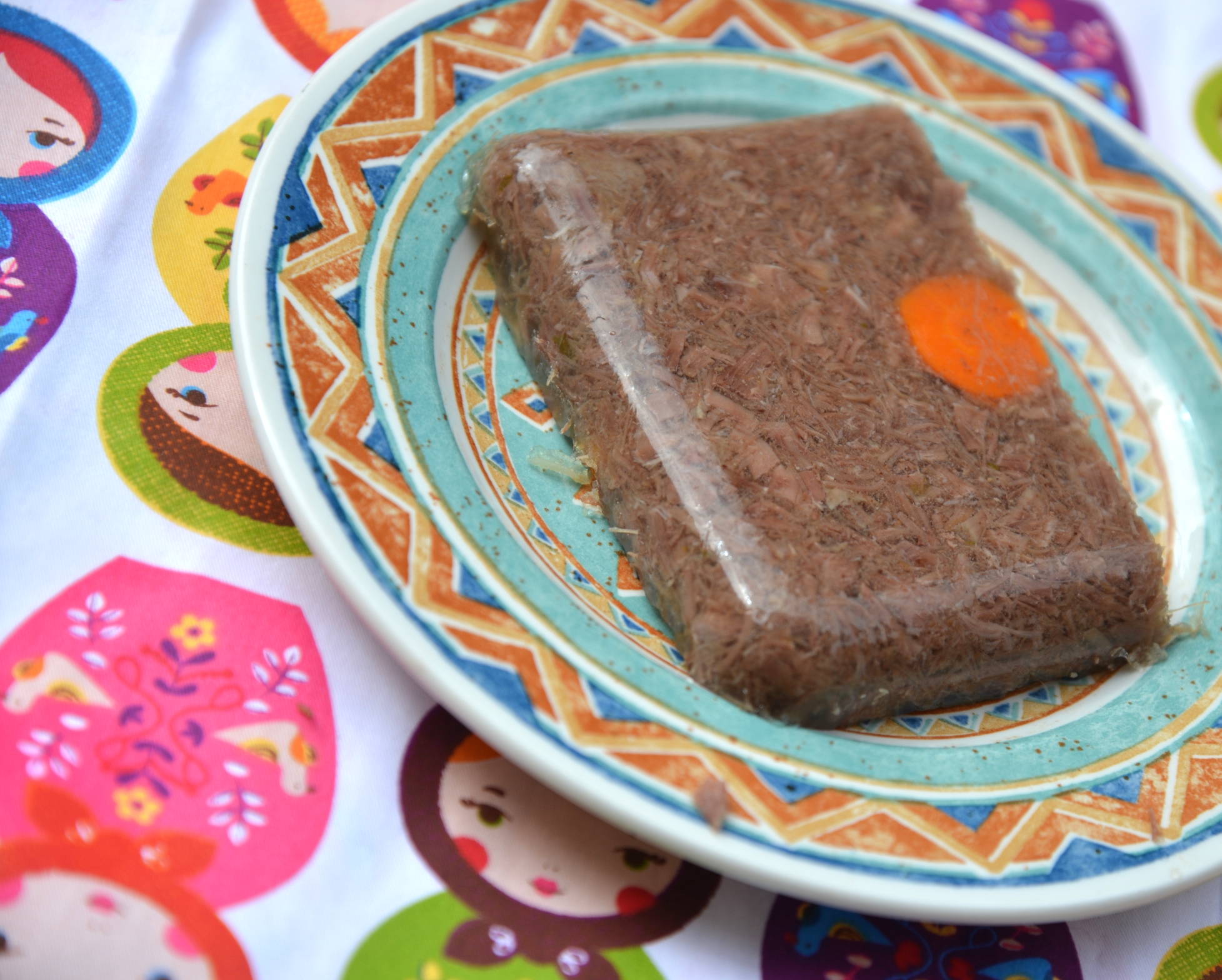 Кажется, мамин полупрозрачный холодец был фотогеничнее: можно было увидеть всякую взвешенную штуку в толще желе, особенно на «сломе». …Помню, мясо использовалось специальное -только «лытка» (часть ноги) годилась для холодца. Забавно вспомнить.
