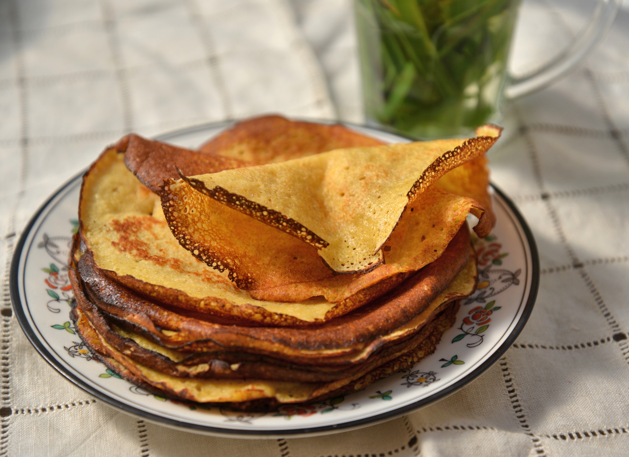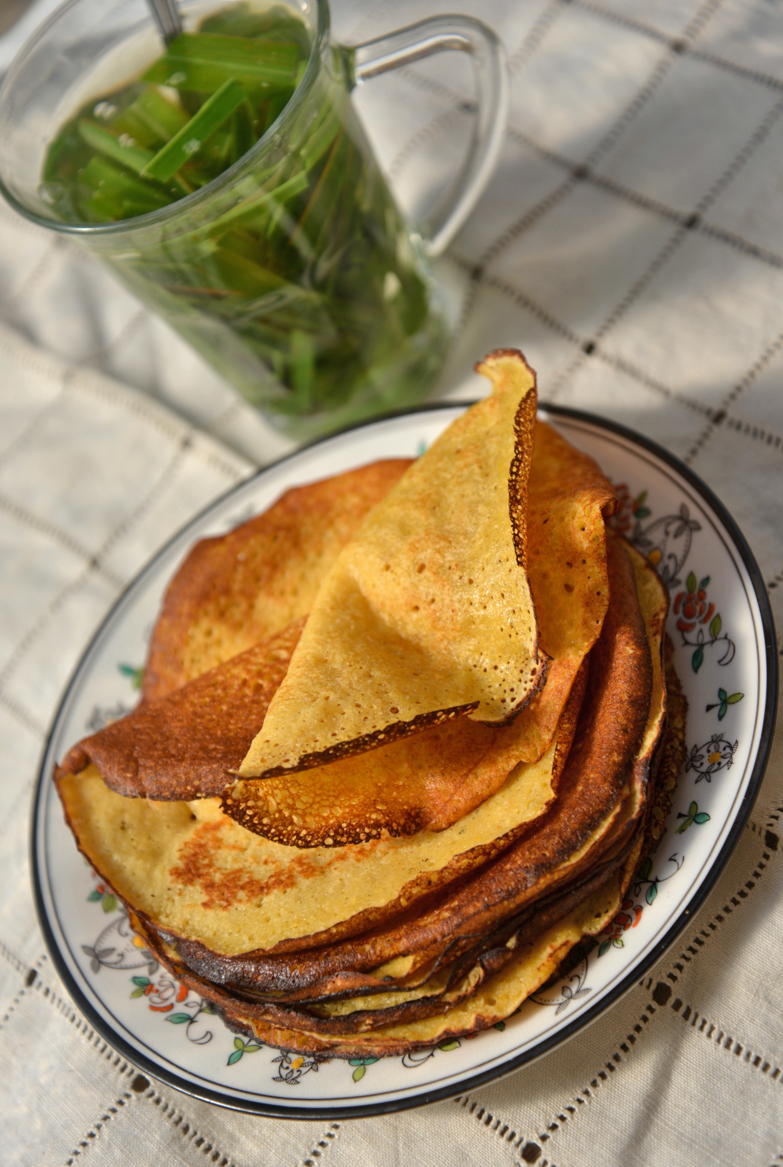 В миску насыпаем хумусную муку и крахмал, наливаем немного молока и растираем муку с молоком, чтобы исчезли комки. Добавляем размешенное яйцо, хорошенько перемешиваем и добавляем оставшееся молоко до получения теста блинной густоты. Солим, сладим и оставляем тесто на полчаса. Через полчаса добавляем молоко, если тесто загустело, наливаем в него растительное масло и начинаем жарить, как мы жарим обычные блинчики. Хорошая сковорода- залог успеха. Чай можно заварить из листьев лемон-грасса. Вкусно и душевно.