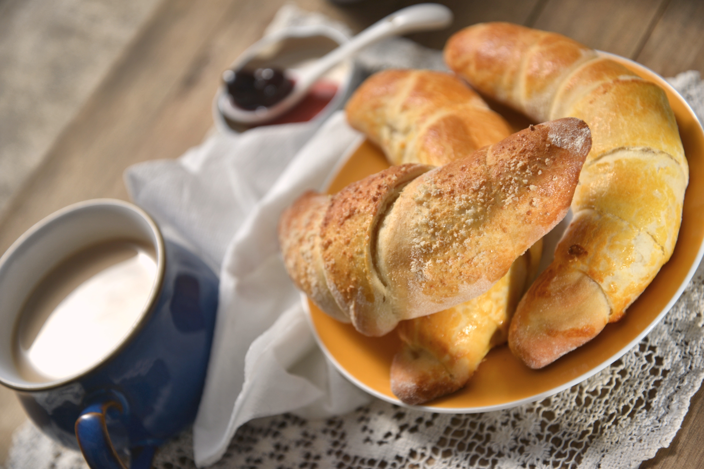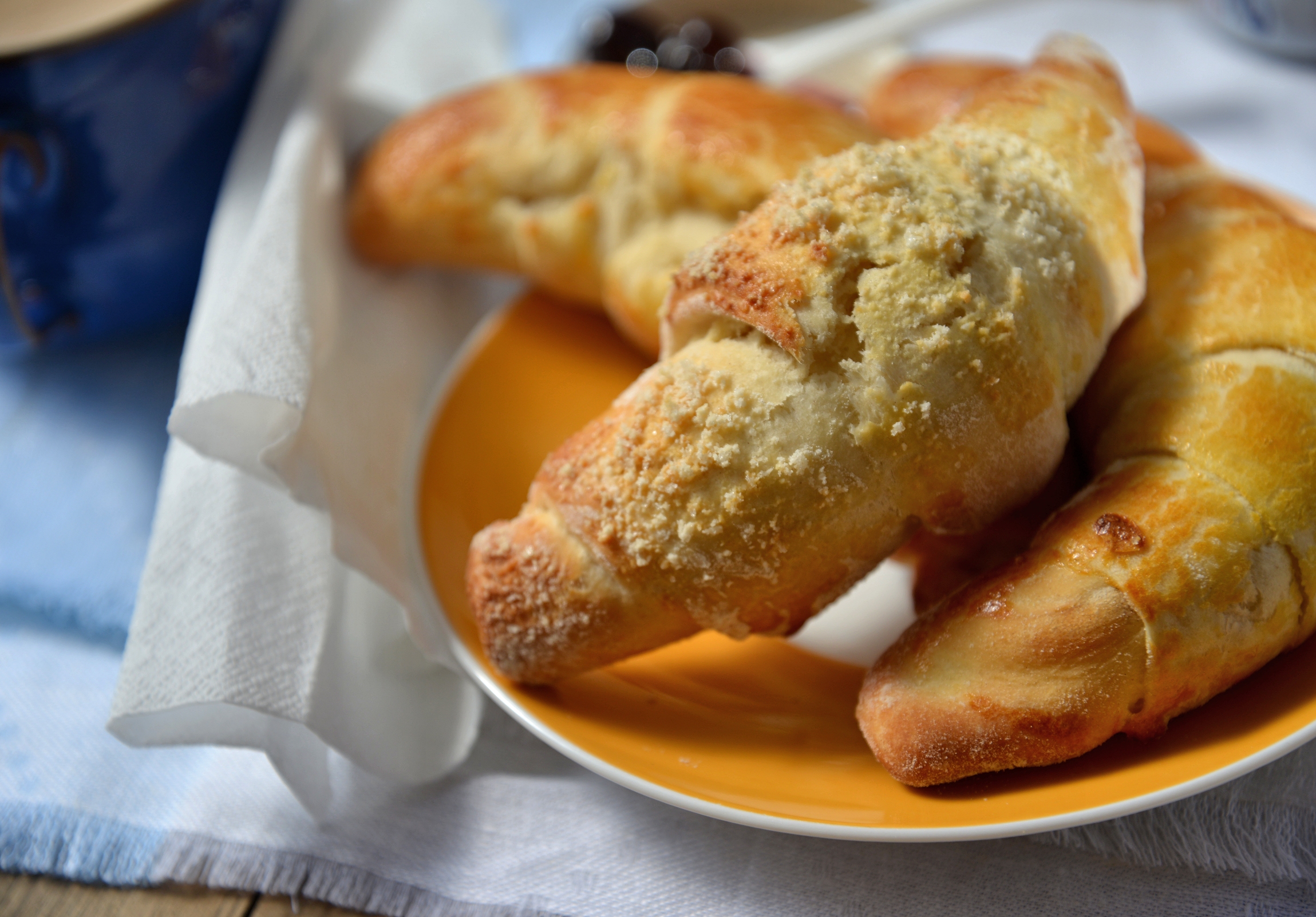 Встаем рано,  минимум за час до нашего завтрака с круассанами. Раскатываем тесто, вырезаем треугольники, затем раскатываем каждый в равнобедренный треугольник с длинными боковыми сторонами. Смазываем его растопленным маслом и закатываем рогаликом, начиная с основания треугольника. Складываем круассоны на противень, застеленный пергаментной бумагой, закрываем полотенцем и ждем 30-40 минут. Разогреваем духовку до 150-170ºС. Смазываем наши рогалики размешенным желтком и ставим в духовку. Печем до золотистого цвета, проверяя время от времени, чтобы не перепечь, что легко может случиться, когда мы имеем дело со сдобным тестом.   Для другого противня круассанов вместо масла я посыпала треугольники смесью сахара и миндальной муки. Видно, что это не фабричное производство.