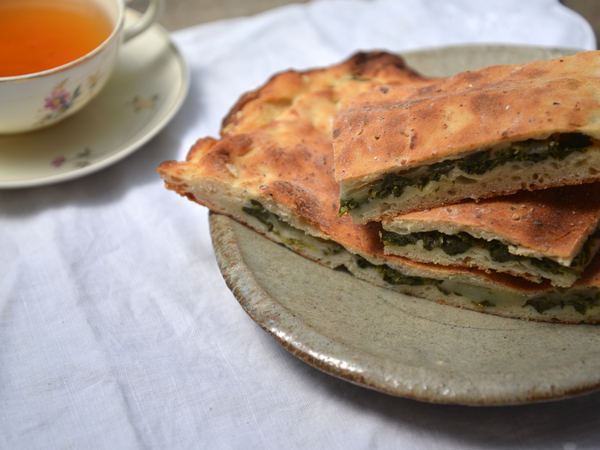 Тесто разделяем на две равные части, раскатываем толщиной в 0.5-1 см одну по размеру противня, который мы смазали слегка маслом. На тесто равномерно раскладываем шпинат, на него пласты моцареллы. Раскатываем второй кусок теста, закрываем пирог и защипываем. Сверху насыпаем немного тертого пармезана. Накрываем пирог полотенцем и нагреваем духовку до 170-180°С. Ждем еще немного и ставим пирог печься. Примерно 20 минут печем, видим, что корочка зарумянилась, вынимаем пирог из духовки. Его можно хранить в холодильнике. Перед тем как есть, разогреваем на сковороде.