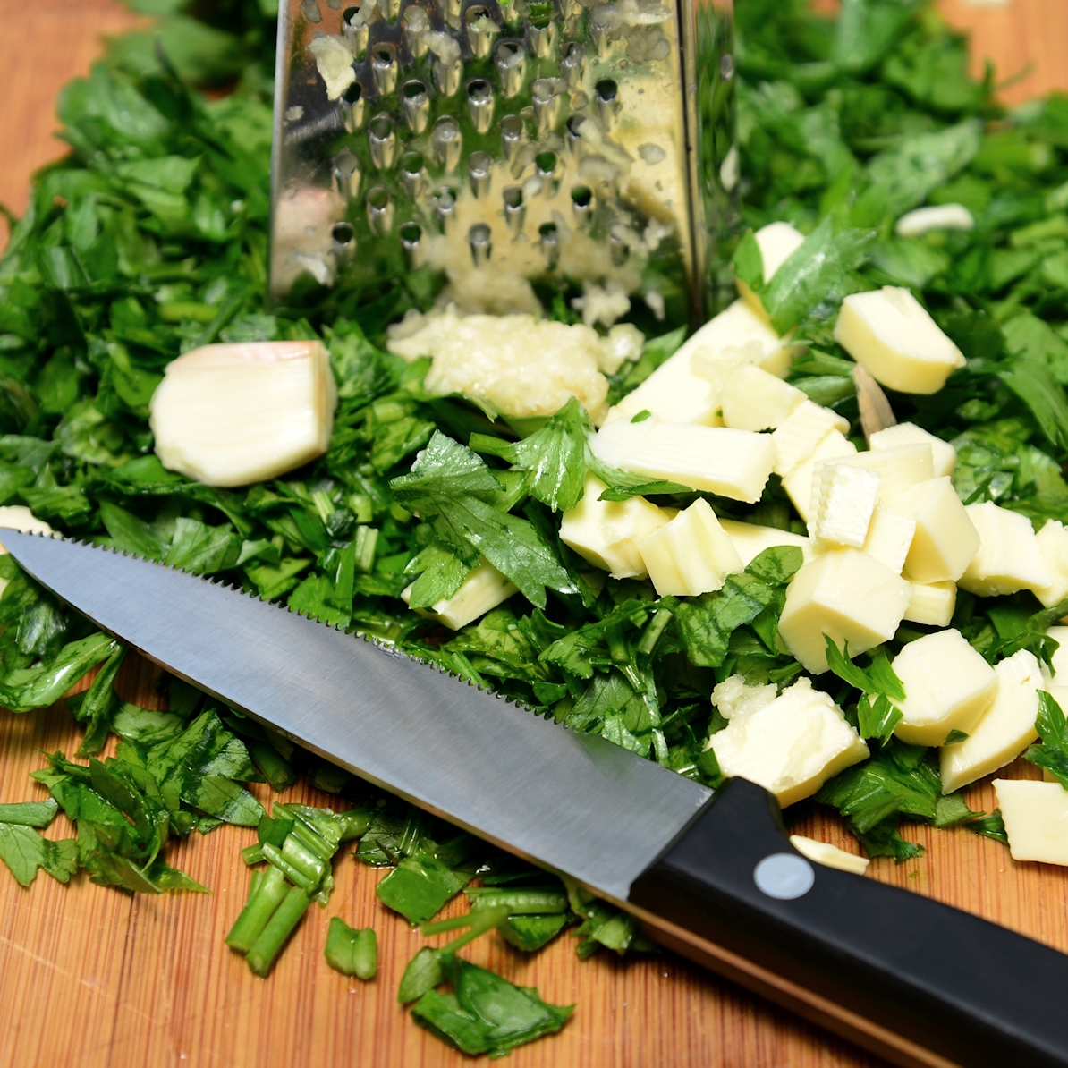Для начинки свежую промытую петрушку нарезаем мелко, добавляем растёртый чеснок, соль, чуть-чуть чёрного перца.