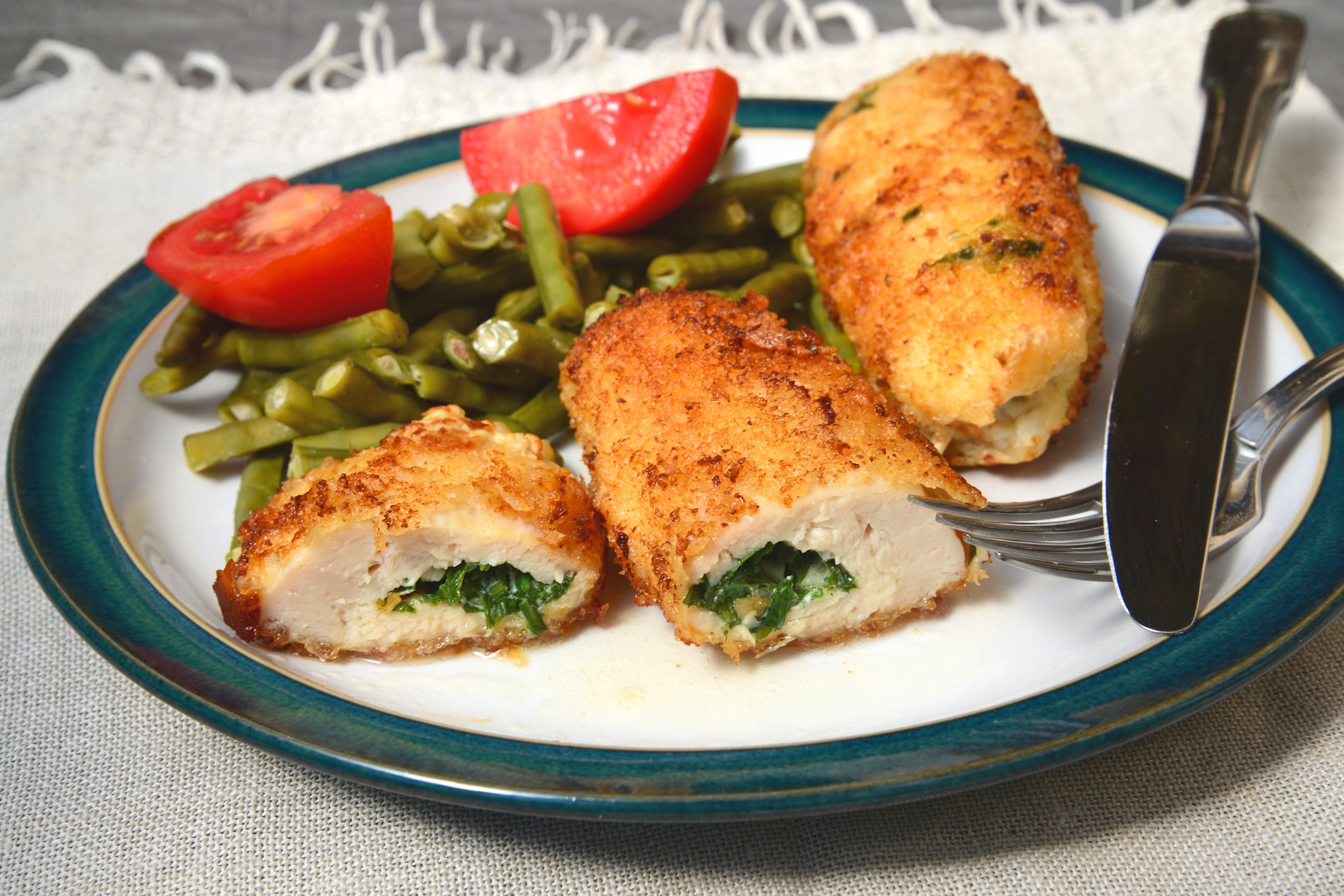 На пласт куриного мяса в середину выкладываем 1-2 столовые ложки начинки, добавляем кусочек холодного сливочного масла. Завертываем в виде маленького рулета или большой котлеты, присыпаем со всех сторон мукой, обмакиваем в размешенном яйце, обваливаем в сухарях и жарим в глубоком масле 7-10 минут, осторожно переворачивая, что бы обжарить со всех сторон. Готовые котлеты выкладываем на несколько слоев бумажных салфеток, чтобы убрать лишнее масло. Сила этого блюда в его свежести, подаём его сразу на стол. Разрезаем котлету и ароматное сливочное масло вытекает на пышное картофельное пюре, взбитое с молоком или сливками