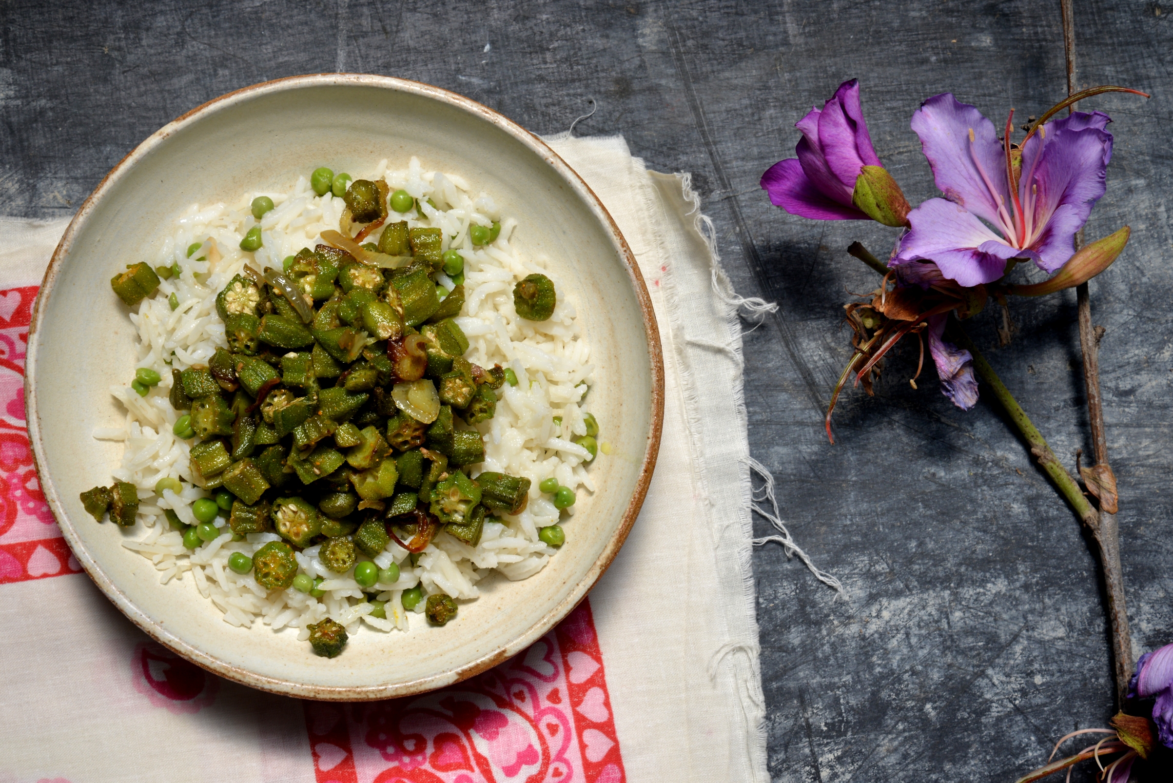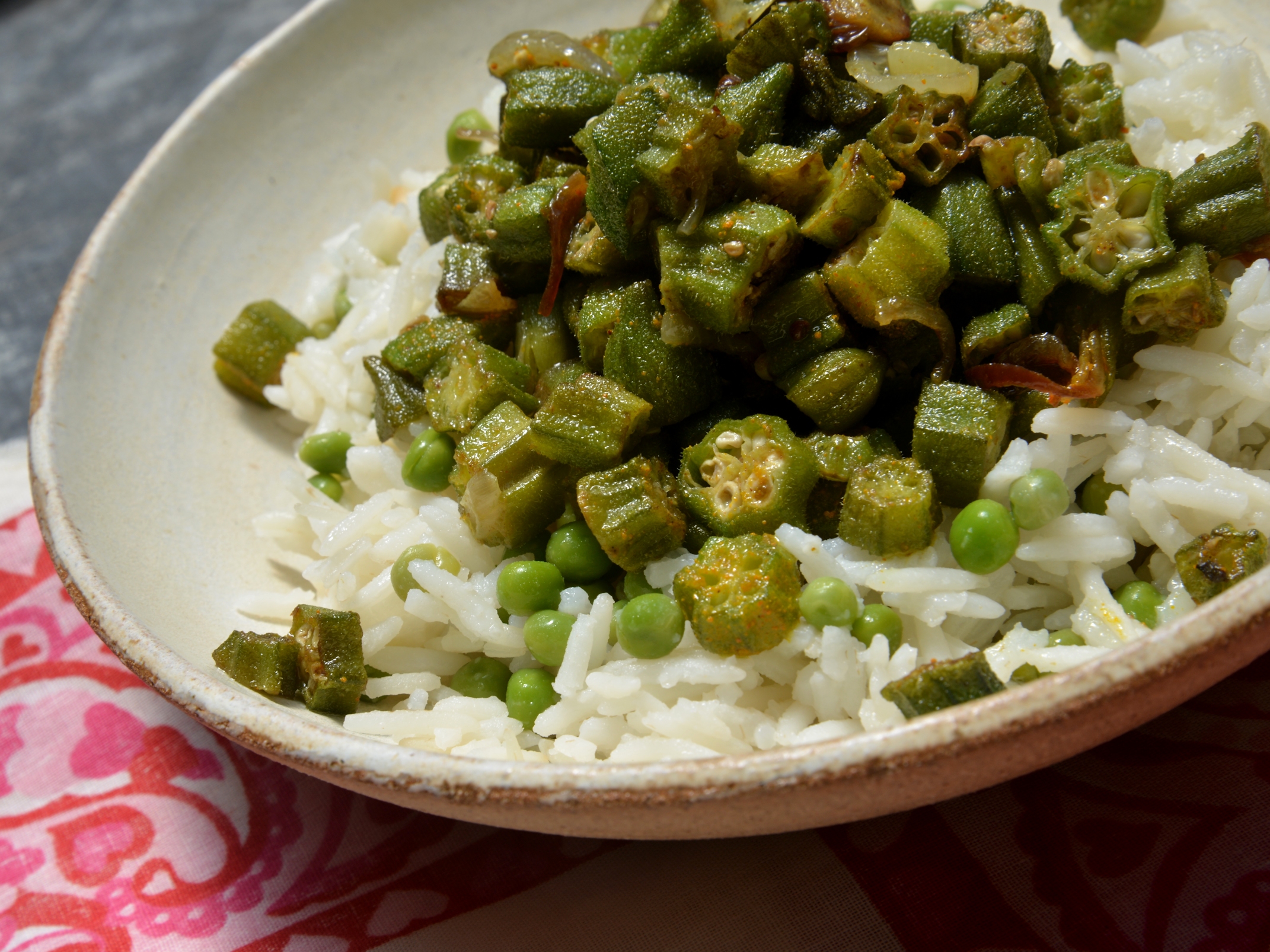 Бамию моем и обсушиваем полотенцем. Затем садим кого-нибудь за тяжелую работу, отрезать хвостики и нарезать бамию кольцами. В Индии, я читала, женщины полдня проводят за нарезкой овощей, очевидно, что так и родилась сложная и запутанная индийская мифология. Для этого блюда нужны индийские специи или что-нибудь похожее: куркум, семена кориадра, кумин, гарам масала — это такая индийская смесь, самый индийский способ — это поджарить целые зерна специй на чистой сковороде, а затем измельчить в ступке. В ту же сковороду, где жарились специи, но уже без них, наливаем немного растительного масла, жарим несколько минут лук шалот, нарезанный кольцами, кладем колечки бамии и жарим 4 минуты. Добавляем специи и перемешиваем. Едим с рисом.