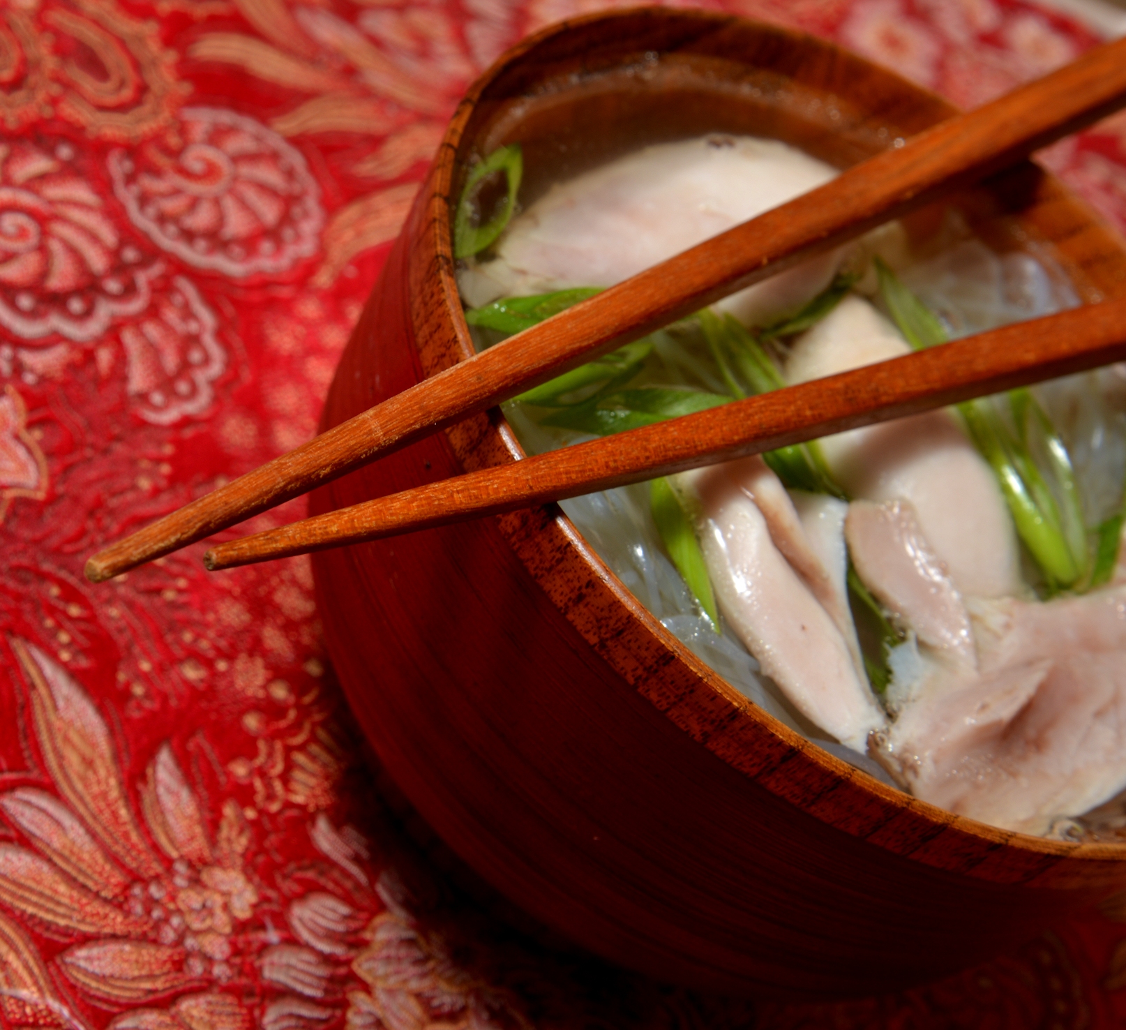 Я варила бульон в керамическом горшочке, есть специальный китайский горшочек для супа, но это отдельная история. 7-8 куриных ножек бланшируем, то есть заливаем водой, доводим до кипения, выливаем воду и промываем мясо. Кладем ножки в горшочек, наливаем четверть стакана китайского вина для готовки (Shaoxing cooking wine), столовую ложку соевого соуса, берем кусок свежего имбиря размером с ноготь большого пальца и мелко нарезаем. Добавляем 1 зубчик чеснока. Наливаем в горшочек воду, доводим до кипения, убираем пену, закрываем крышкой, убавляем огонь и варим 3-3.5 часа. Солим и перчим. Перед подачей в тарелку кладем готовую обычную лапшу или вермишель из риса, наливаем бульон, кладем мясо и зеленый лук.