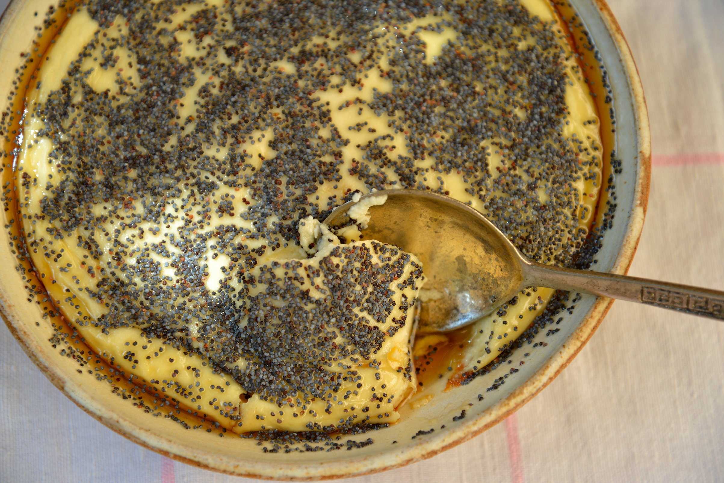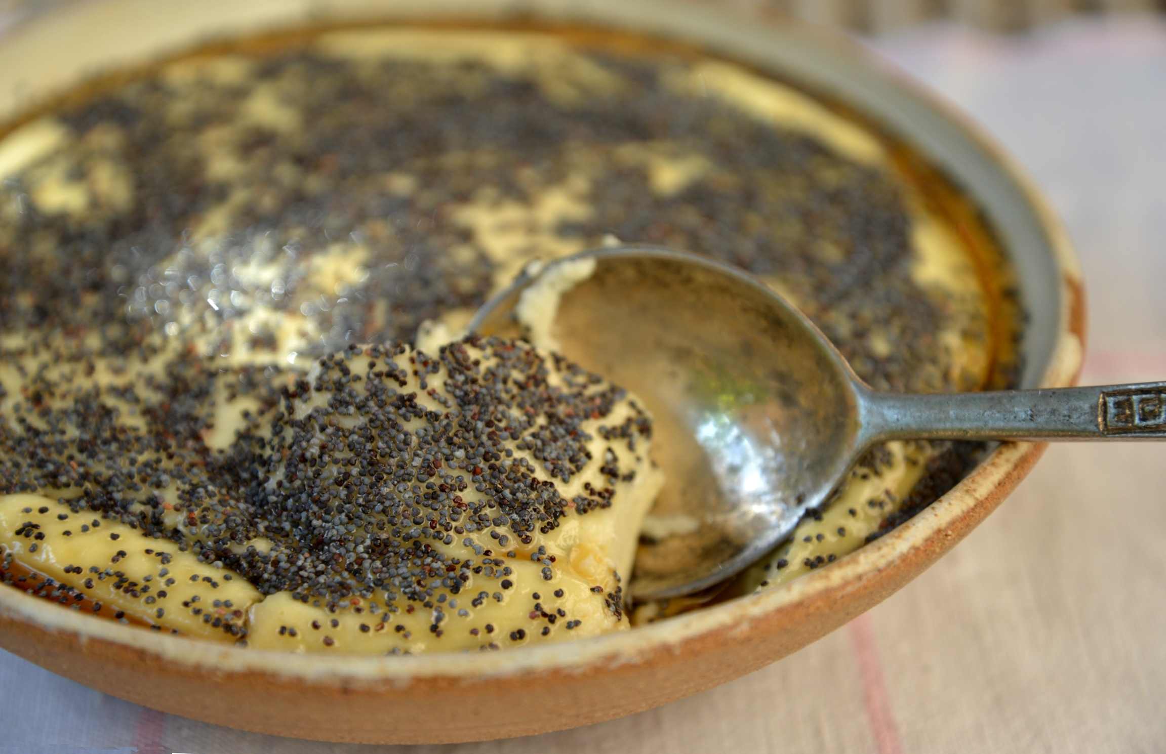 84 Рецепт для savillum: Возьмите ½ фунта муки, 2 ½ фунта сыра и перемешайте вместе, как для libum; добавьте ¼ фунта меда и 1 яйцо. Смажьте глиняное блюдо с маслом. Когда вы тщательно перемешаете, залейте в блюдо и накройте черепком от кувшина. Смотрите, чтобы испекся центр. Когда испечется, уберите черепок, смажьте пирог медом, посыпьте маком, закройте черепком на некоторое время, а затем уберите из огня. Подавать в блюде с ложкой.
