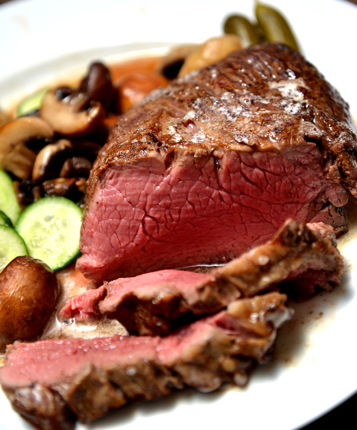 Этот стейк взял свое имя не от писателя, а от города Châteaubriant, а соус, может быть, и правда назван в честь писателя François-René de Chateaubriand, Франсуа Рене Шатобриан, которого ценили Пушкин, Батюшков и Набоков. В советской стране творчество Шатобриана было объявлено реакционным, его не переиздавали до 1982 года, и работы его были не рекомендованы к изучению советским литературоведам, которые изучали все. Честно, я не читала, пора, пора. Посмотрела на рецепты в Интернете, каждый славит свой шатобриан. В моей книге Эскофье нет такого стейка. Про все стейки там замечено немногословно : мясо смазать жиром и пожарить. Из всей информации я вынесла главное — для шатобриана надо взять немаленький толстенький кусок свежего (а не замороженного) говяжего филе, потому что шатобриан не едим в одиночку. Неважно как мы будем его жарить, на сковороде, на углях или запекать в духовке, помним Медиум — это 52-55 º С, градусы меряем специальным градусником. Мне понравилась технология, по которой мясо обсушивается чистым полотенцем, обжаривается со всех сторон, а затем ставится в духовку, нагретую до 150ºС, примерно на 15 минут, проверять температуру надо и в этом случае.
