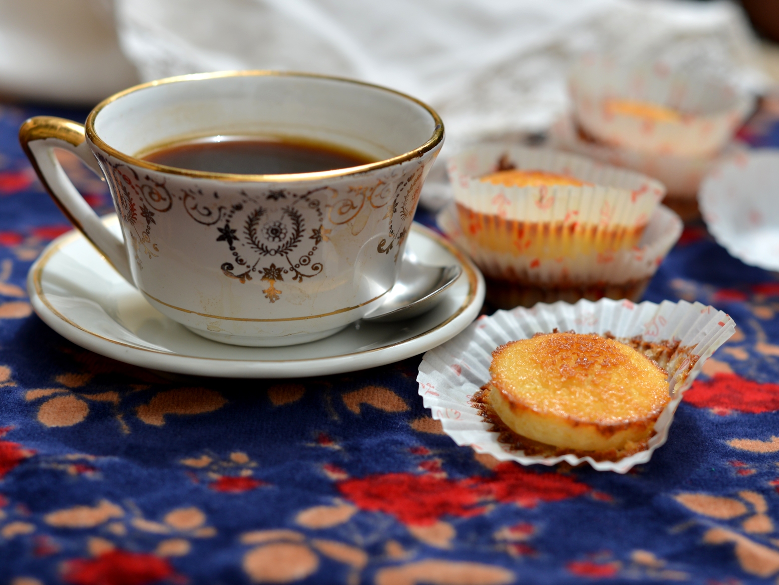 Кокос можно размельчить еще мельче, но я оставила как есть. Крахмал разводим в небольшом количестве молока. Яйца взбиваем с сахаром до побеления, добавляем молоко, молоко с крахмалом, цедру, растопленное масло. Перемешиваем. На противень раскладываем бумажные формочки для маффинов и столовой ложкой наливаем в них тесто до половины, все время перемешивая тесто. Печем минут 20, пока не зарумянятся. Если взять формочки для суфле, получится десерт типа крем брюле.