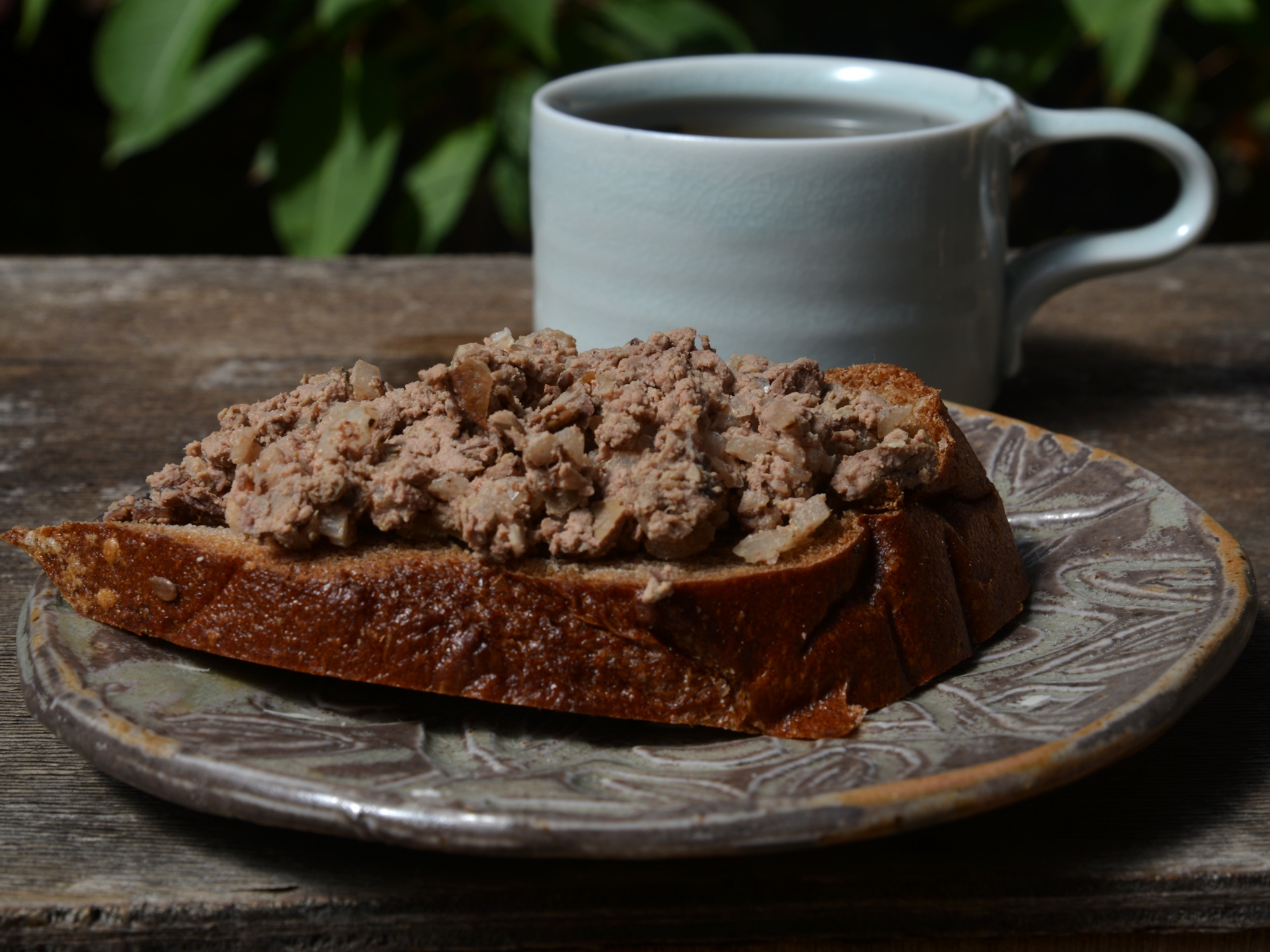 Во время праздников я узнала еще один рецепт куриного паштета, который, как известно, неисчерпаем как не знаю что. В этом рецепте нужно достичь максимального количества мелко накрошенного сырого лука, который перемешиваем с порубленной печенью, испеченной в духовке с небольшим количеством растительного масла. Солим, перчим, никаких нежностей. Количество жиров в этом паштете минимально, если сравнить с французскими рецептами. Как всегда, стремление сделать блюдо экономным ведет к отличному результату. На черный хлеб кладем слой грубоватого паштета, завариваем чай, не жалея заварки, и можно пережить сентябрьскую жару.