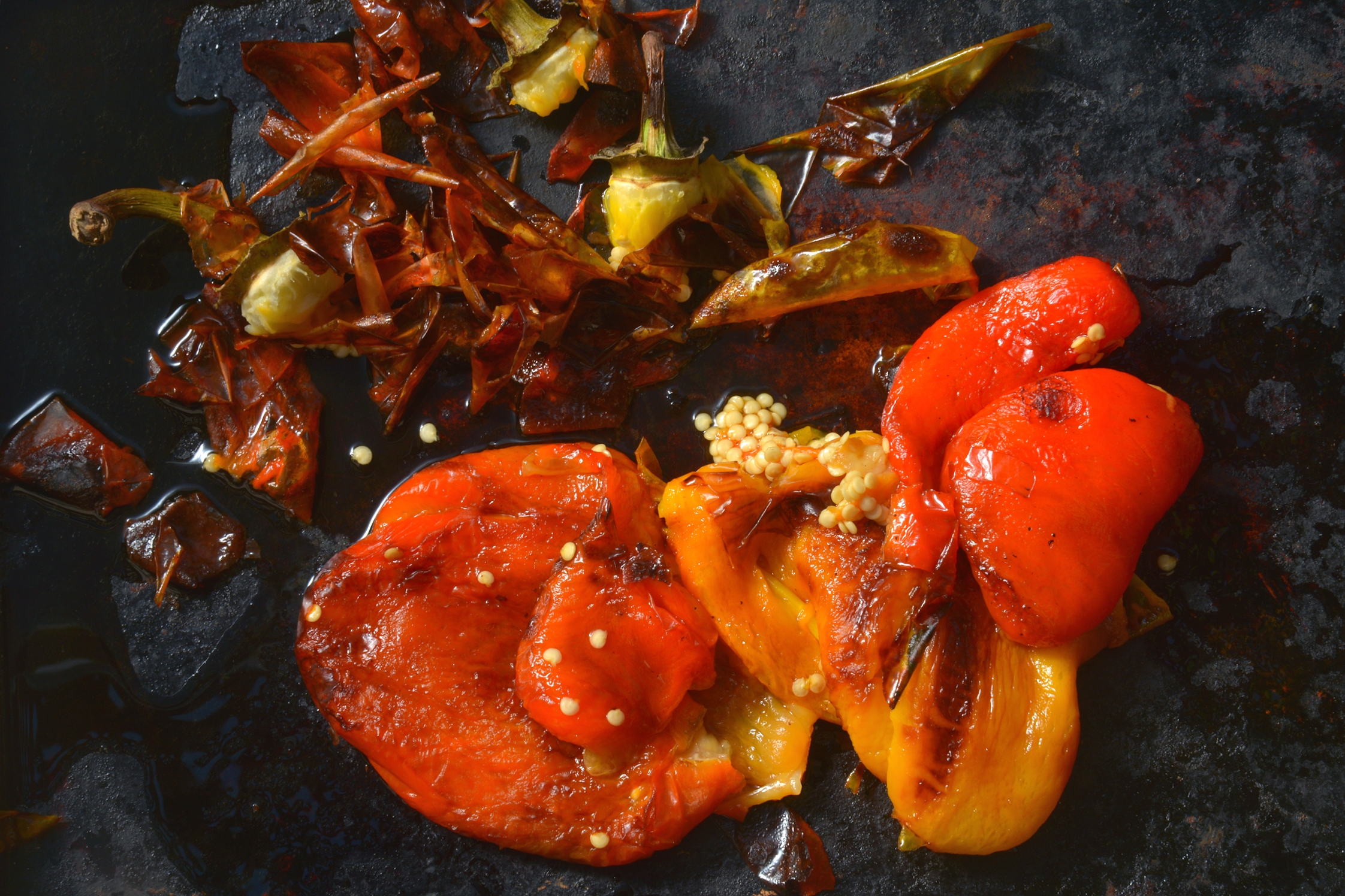 Перцы моем и ставим на противне печься в духовку. Печем пока они не потемнеют дочерна со всех сторон. Остывшие перцы чистим, удаляем сердцевину с семенами и нарезаем полосками. Готовим заправку: 2 столовых ложки оливкового масла, 2 столовых ложки бальзамического уксуса, натертый чеснок, соль, перец. Кладем перцы в стеклянную посуду, заливаем заправкой и оставляем в холодильнике, пока перцы не охладятся окончательно.