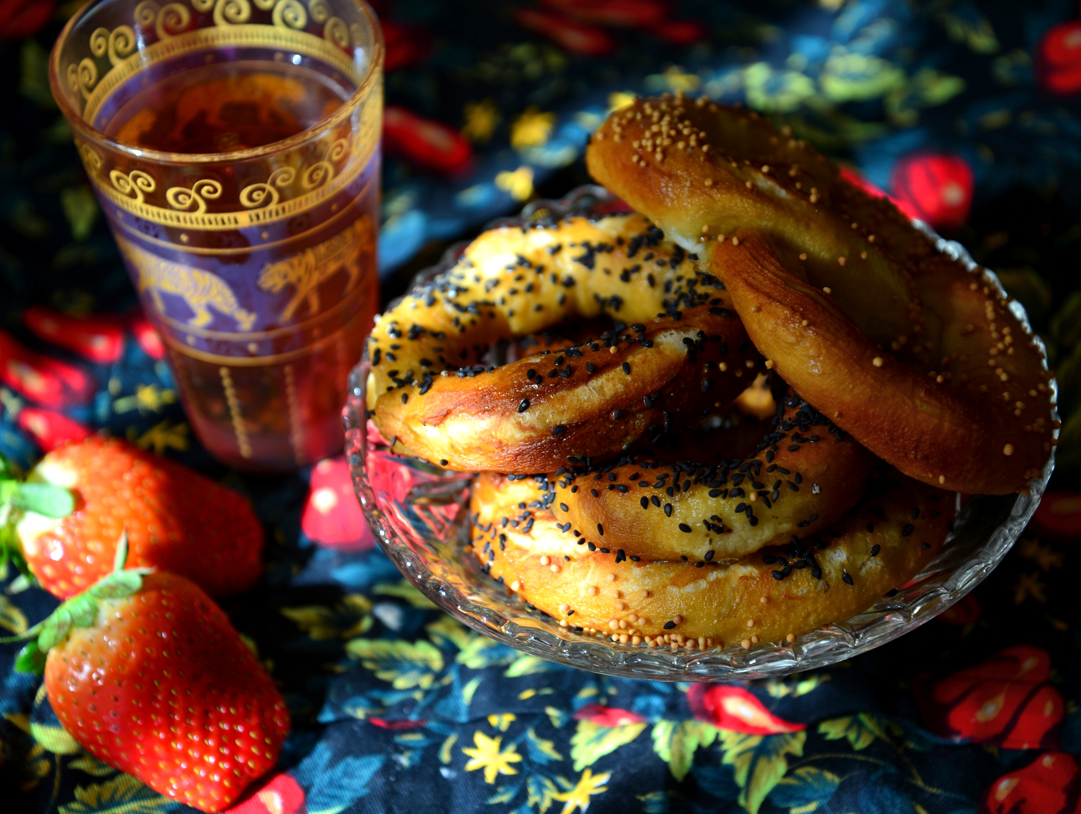 Тем временем в кастрюлю наливаем 8 стаканов воды, насыпаем туда испеченную соду и доводим до кипения. Каждый бублик по одному осторожно отправляем в кипящий содовый раствор на 20 секунд, 10 секунд на одной стороне, 10- на другой. Вынимаем его, обсушиваем бумажной салфеткой и кладем на противень с пергаментной бумагой. Смазываем желтком и присыпаем присыпкой. Печем до готовности. Едим с маслом, вареньем и горячими с чаем.
