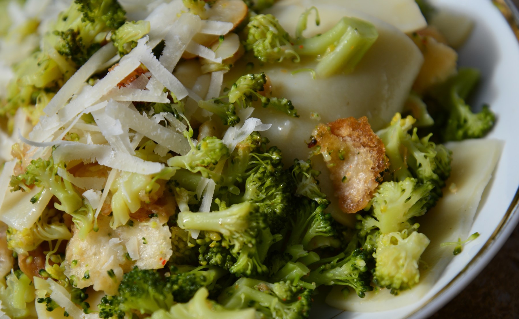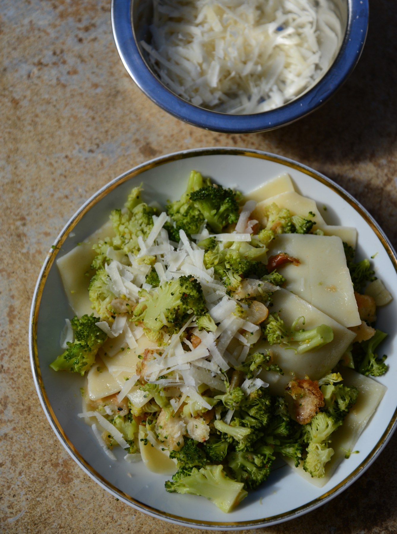 Варим пасту. Брокколи отвариваем в небольшом количестве подсоленной воды в течение 5 минут и откидываем на дуршлаг. На сковороду щедро наливаем оливкового масла, крошим чеснок и жарим несколько минут, на зажаривая. Добавляем сухари, затем мелко нарезанную и слегка примятую капусту брокколи и продолжаем жарить. Солим перчим. Перемешиваем с пастой, при подаче насыпаем немного тертого пармезана.