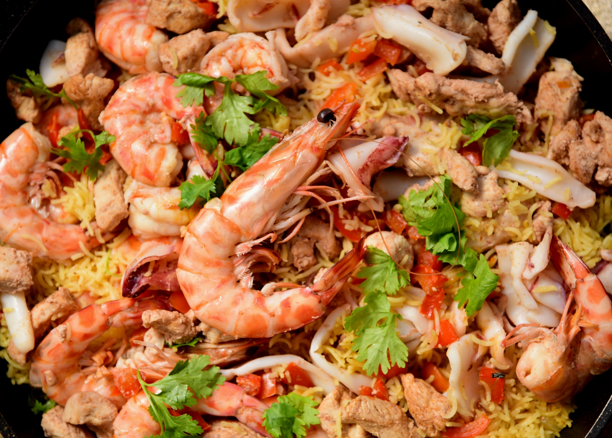 Сковороду ставим на небольшой огонь, наливаем немного оливкового масла, кладем специи, лук и чеснок, нарезанные мелко, лимонную цедру и шафран. Перемешиваем и обжариваем 2-3 минуты на маленьком огне. Добавляем рис и продолжаем обжаривать, постоянно перемешивая. Можно налить немного белого сухого вина и дать алкоголю выпариться. Затем наливаем воду комнатной температуры, количество воды определяем на глаз, по ходу варки можно воду добавлять, но убавлять не желательно. Варим рис до готовности. Тем временем на другой сковороде на оливковом масле жарим овощи с небольшим количеством лука и чеснока на небольшом огне. У нас никогда ничего не пригорает! Когда овощи будут готовы, добавляем куриное мясо, жарим все вместе, затем морепродукты и, помешивая, доводим все до готовности. Главное, остановиться вовремя, чтобы сохранить сочность продуктов. Перекладываем содержимое этой сковороды в сковороду с рисом, не забывая о соусе на дне.