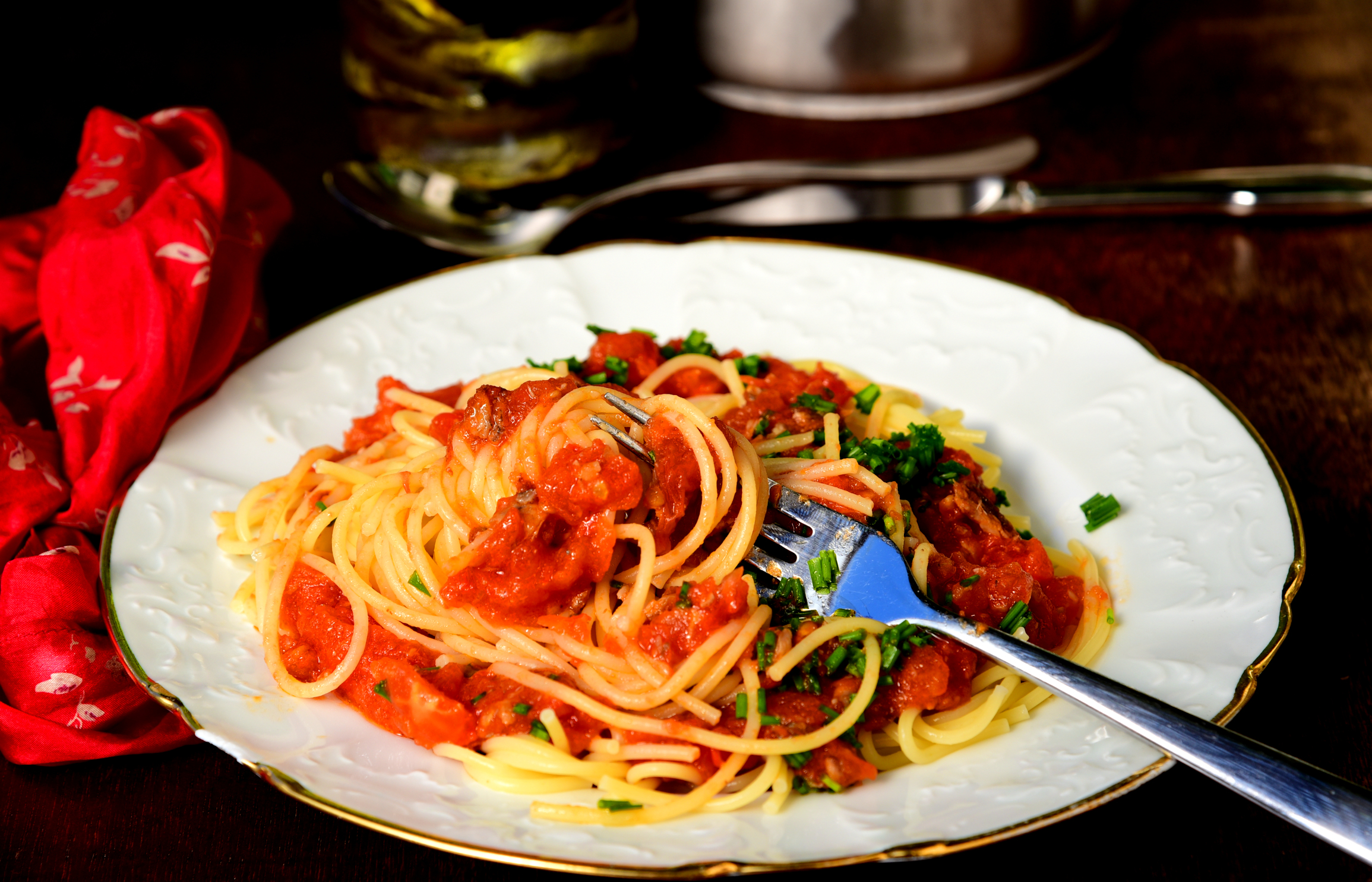 Cковороду ставим на огонь, наливаем оливкового масла, нарезаем чеснок пластами и жарим его до золотистого цвета. Убираем чеснок, кладем в сковороду кусочки филе соленых сардин и жарим 5 минут на небольшом огне. Добавляем помидоры, нарезанные мелко, и продолжаем жарить минут 15-20. Следим за соусом и перемешиваем время от времени. Варим пасту. Соус и паста должны быть готовы одновременно. Пармезан всегда хорош к пасте, но у меня кончился.