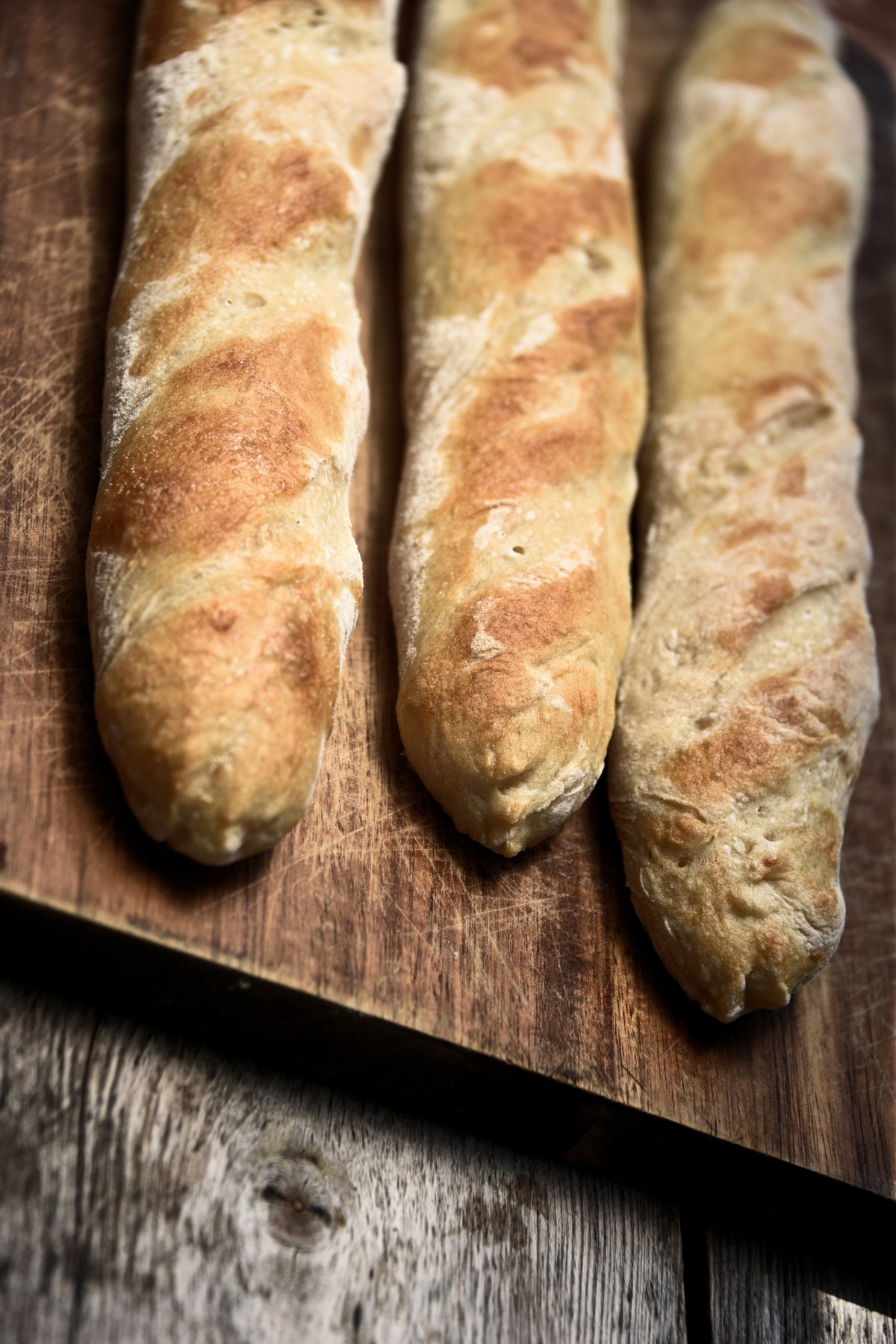 Рецепт для теста из Википедии, я им заплатила вчера 50 ш, застали меня врасплох, когда изнемогала в автобусе: сначала ставят на 20 минут опару из пшеничной муки, воды и дрожжей, затем добавляют муку, соль и воду, вымешивают 10 минут и дают постоять 45 минут, разделывают на длинные батоны, делают, как минимум, три надсечки ножом, оставляют под влажной тканью ещё на 40 мин. для поднятия, затем выпекают в печи 15 минут.