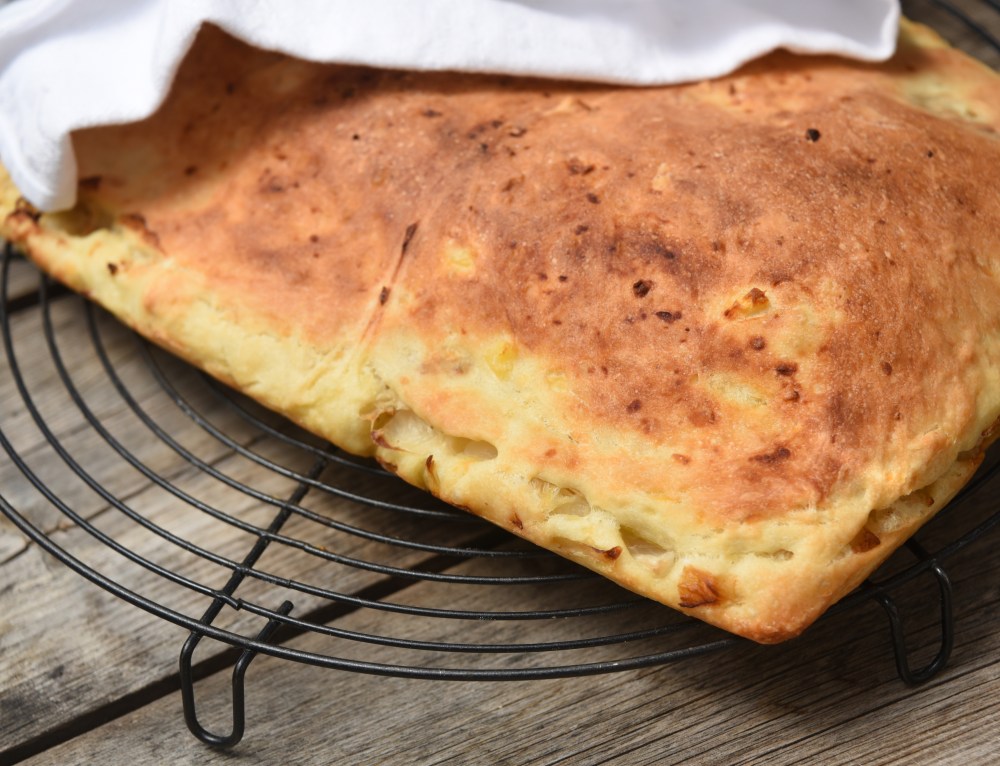 А у фокаччи-хлеба — сотни вариантов начинки — оливки, помидоры, зелень, чеснок и т. д…..главное, уложить тесто в форму правильного размера, тесто должно доходить до границ