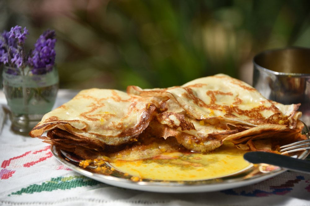 В последнее время я часто делаю блины: для внуков, для старенькой бабушки, иногда для друзей. Особенно хороши блины с цельным голландским молоком, которое у нас в Яффо появилось в продаже. Вершина блинного творчества — сладкие блинчики Сюзетт. Блинчики обычные. Складываем их на тарелке четвертинками.