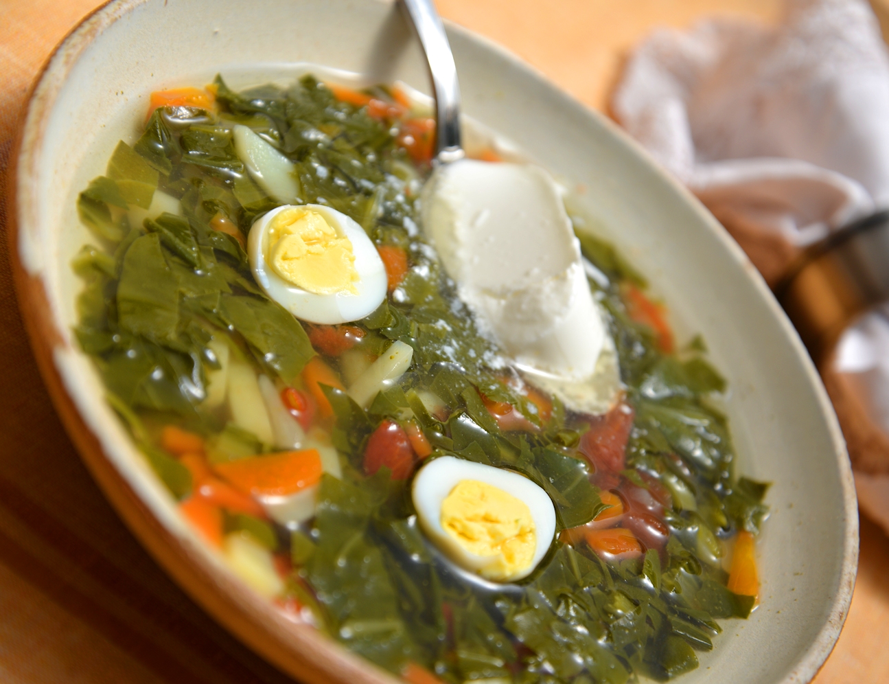 Place an onion, two carrots (finely chopped), a tomato, parsley leaves, and chopped potato in a large saucepan with water. Cook them in the saucepan until tender. Rinse green leaves and cut them into narrow strips, place the leaves in the saucepan and cook until soft and bright green. If the greens lack taste, add lemon juice.